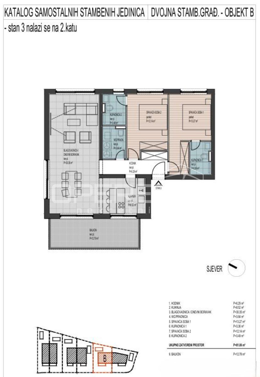 Stan S3B smješten je na 2. katu, stambene površine 81,06 m², s pažljivo osmišljenim rasporedom: hodnik, praonica, WC, 2 kupaonice, prostrani dnevni boravak i blagavaonica, kuhinja, 2 dvije spavaće sobe i balkon od 12,79 m² (koef. 0,50).