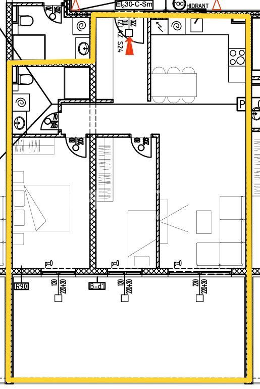 Sastoji se od: hodnika, kuhinje+blagavaonica+dnevni boravak, 2 spavaće sobe, kupaonice i prostrane lođe od 29,61m2 (koef. 0,75=22,21m2). Dodatno, u cijenu stana uključena je i krovna terasa koja se prostire na 100,98m2 (koef. 0,25=25,25m2).