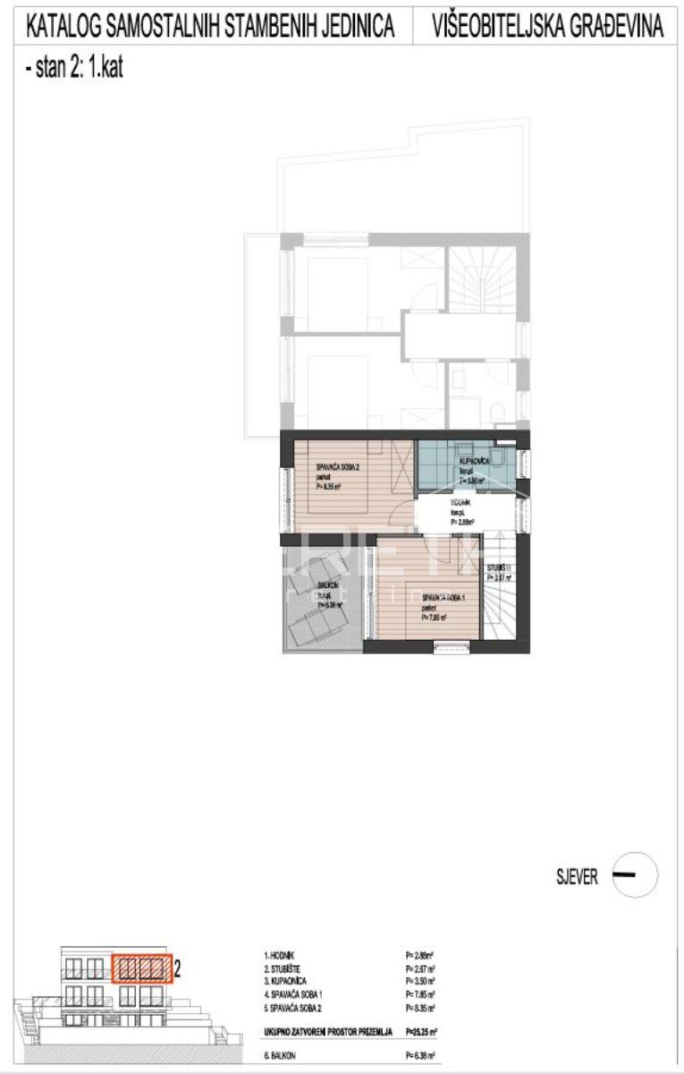 Stan S2 smješten je na drugoj i trećoj etaži zgrade koja sadrži samo 3 stambene jedinice, prostire na 2 etaže – stambene površine 51,05m2 zatvorenog prostora, te 2 balkona od 9,13m2 i 6,38m2, s pažljivo osmišljenim rasporedom: