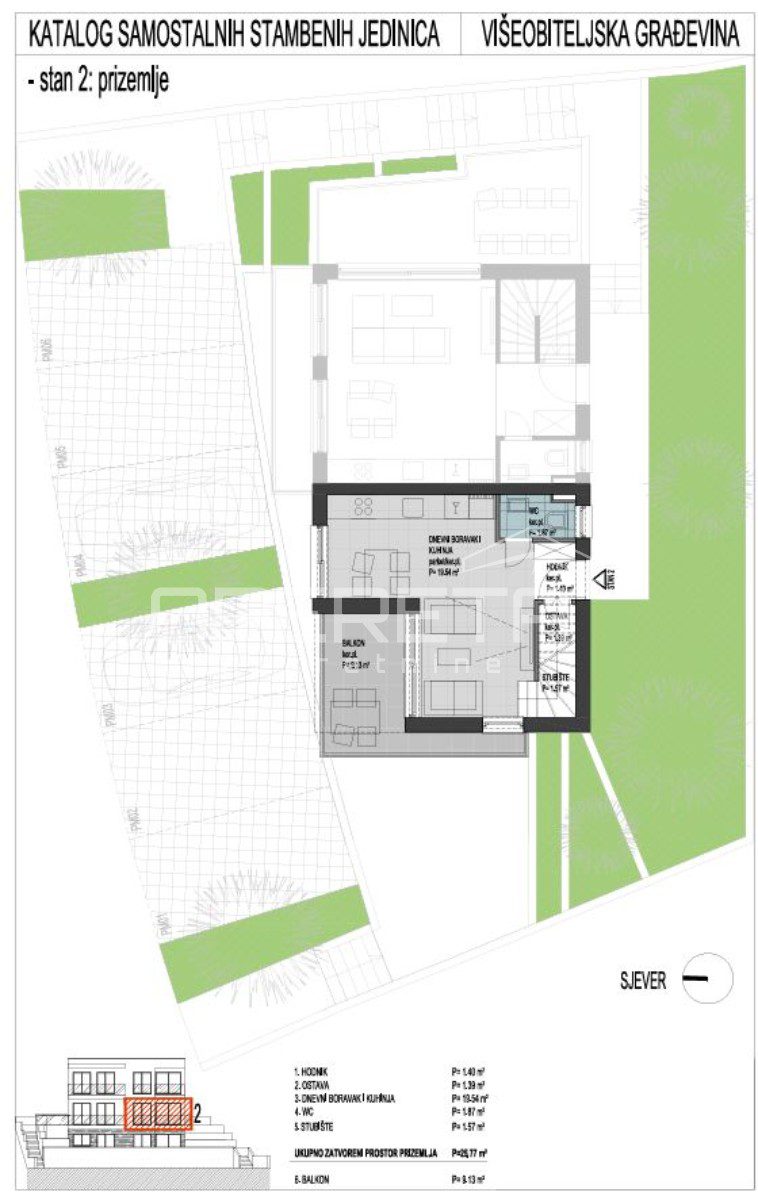 1.ETAŽA: hodnik, ostava, WC, prostrani dnevni boravak i blagavaonica, kuhinja, stubište i balkon 9,13m² (koef. 0,50). 2.ETAŽA: 2 spavaće sobe, hodnik, kupaonica, stubište i balkon 6,38m2 (koef. 0,50).