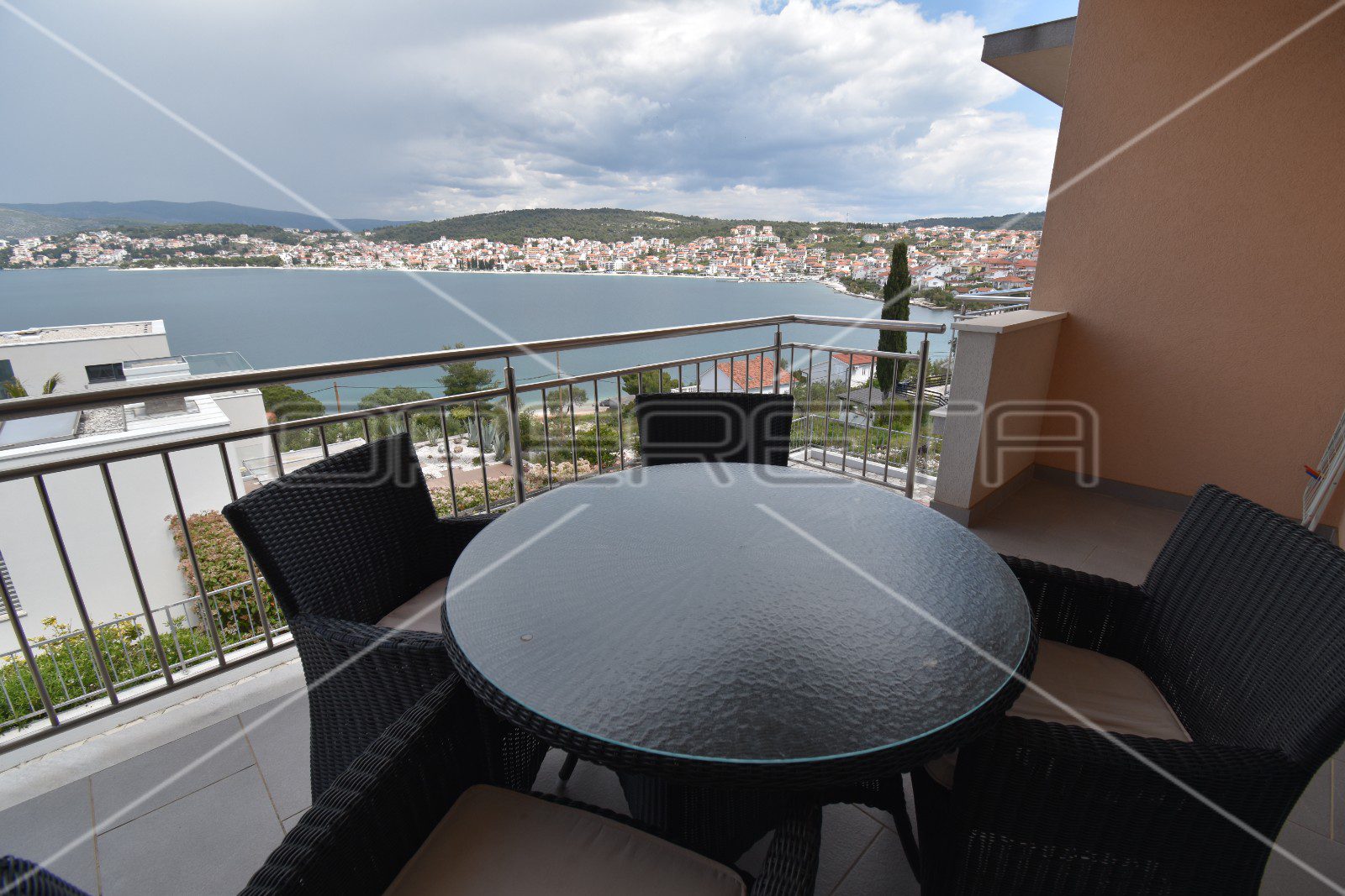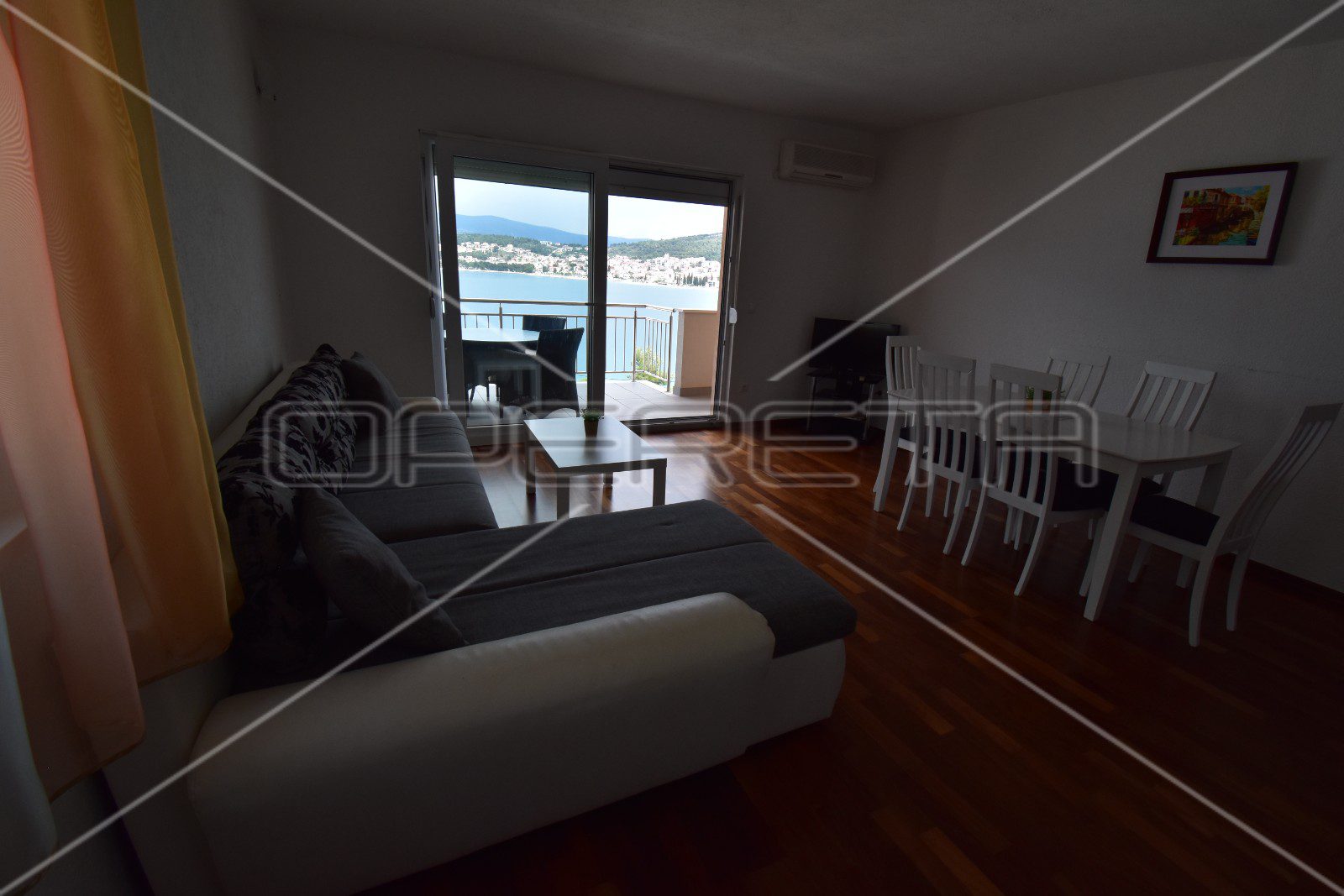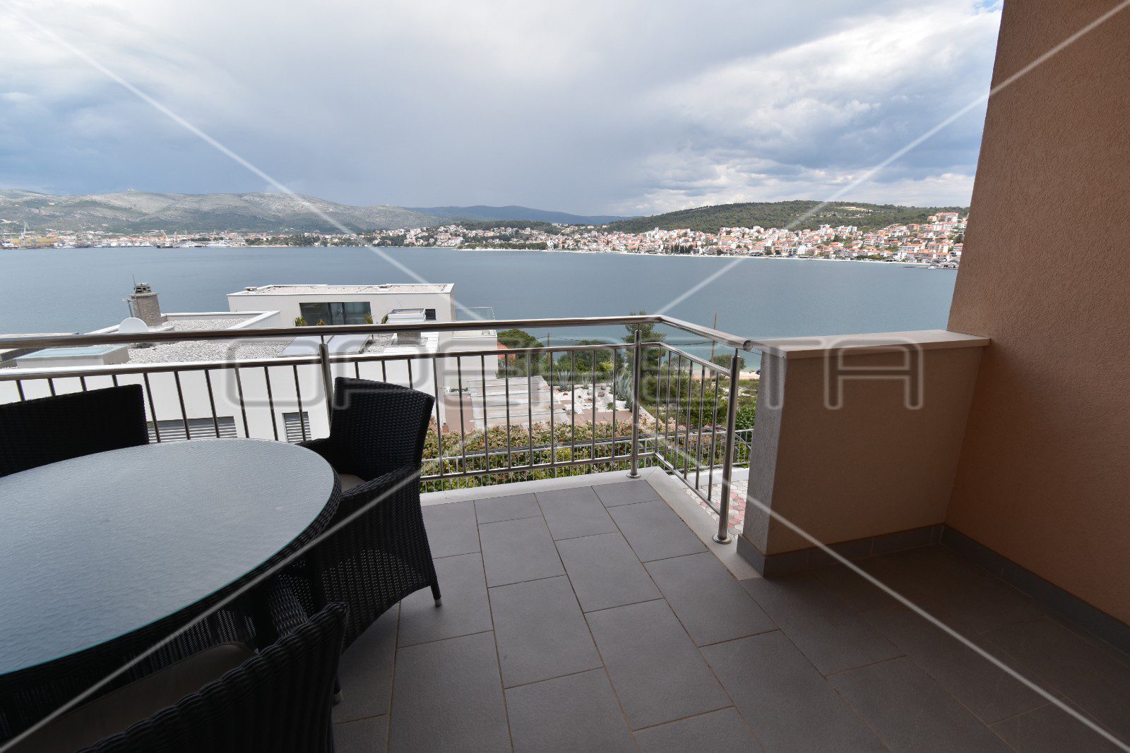 Velika staklena stijenka u dnevnom boravku, osim puno svjetla, pruža i izlaz na poluzatvorenu lođu s koje se pruža prekrasan otvoreni pogled na more.