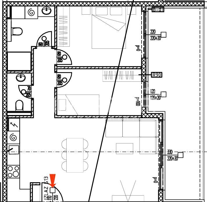 Stan S13 se nalazi u prizemlju zgrade s ukupno 28 jedinica, stambene površine 79,64m2 i ukupne obračunske površine 74,51m2. Sastoji se od: hodnika, kuhinje+blagavaonica+dnevni boravak, 2 spavaće sobe, kupaonice, zasebnog wc-a i prostrane lođe od 20,53m2 (koef. 0,75=15,40m2).