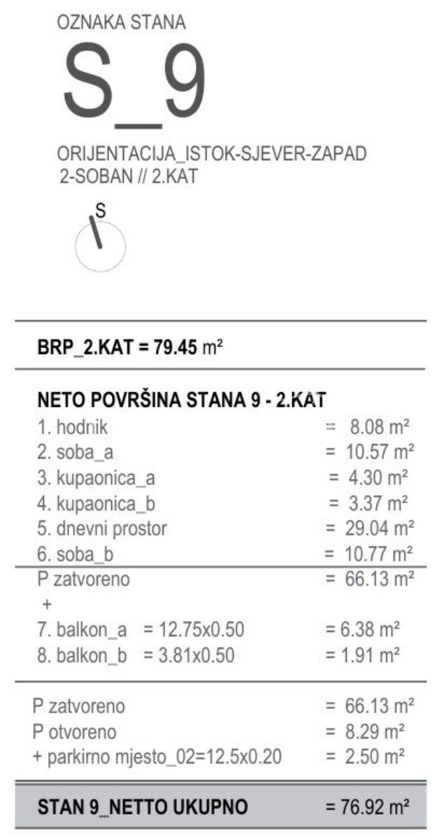 Stan S9 nalazi se na 2. katu i ima neto obračunsku površinu 76,92 m². Sastoji se od: hodnik = 8.08 m², soba_1 = 10.57 m², kupaonica_1 = 4.30 m², kupaonica_2 = 3.37 m², dnevni prostor = 29.04 m², soba_2 = 10.77 m², balkon_1 = 12.75×0.50 = 6.38 m², balkon_2 = 3.81×0.50 = 1.91 m², parkirno mjesto_02=12.5×0.20 = 2.50 m²