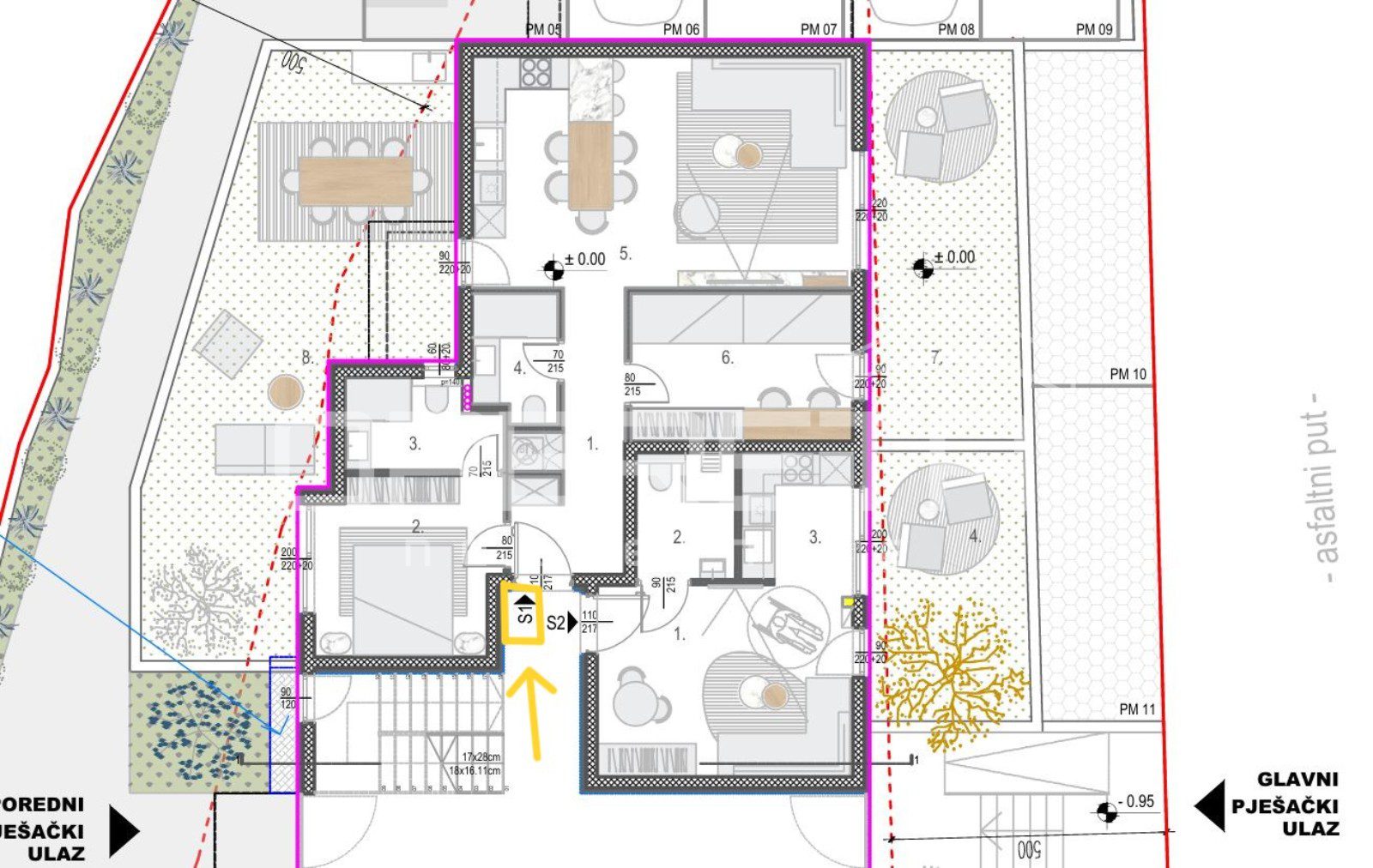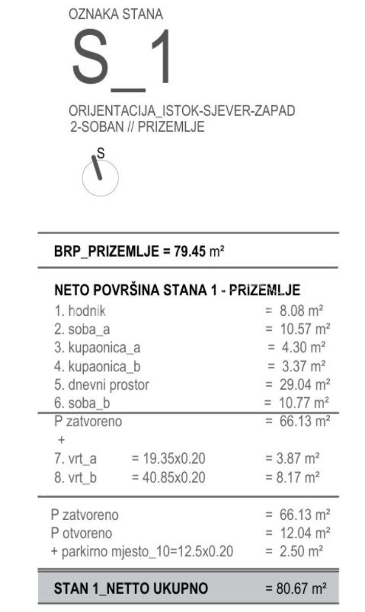 Stan S1 nalazi se u prizemlju i ima neto obračunsku površinu 80,67 m². Sastoji se od: hodnik: 8,08 m², soba 1: 10,57 m², kupaonica 1: 4,30 m², kupaonica 2: 3,37 m², dnevni boravak s kuhinjom i blagovaonicom: 29,04 m², soba 2: 10,77 m², vrt 1: 40.85×0.20 = 8.17 m², vrt 2: 19.35×0.20 = 3.87 m², parkirno mjesto_10: 12.5×0.20 = 2.50 m².