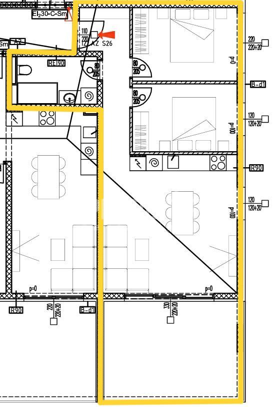 Stan S26 se nalazi na 2. katu i posljednjem katu zgrade s ukupno 28 jedinica, neto stambene površine 66,78m2 (bruto 76,25m2) i ukupne obračunske površine 84,55m2 sa krovnom terasom.
