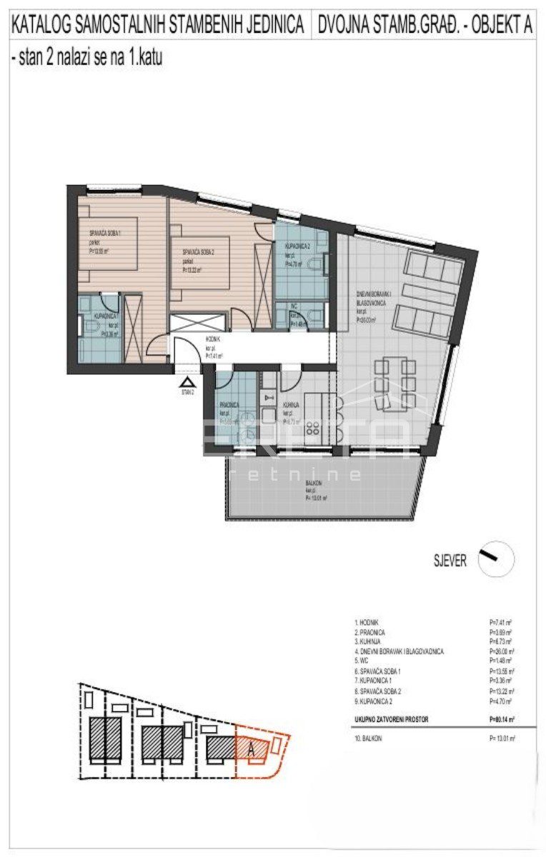 Stan S2A smješten je na 1. katu, stambene površine 80,14 m², s pažljivo osmišljenim rasporedom: hodnik, praonica, WC, 2 kupaonice, prostrani dnevni boravak i blagavaonica, kuhinja, 2 dvije spavaće sobe i balkon od 13,01 m² (koef. 0,50).