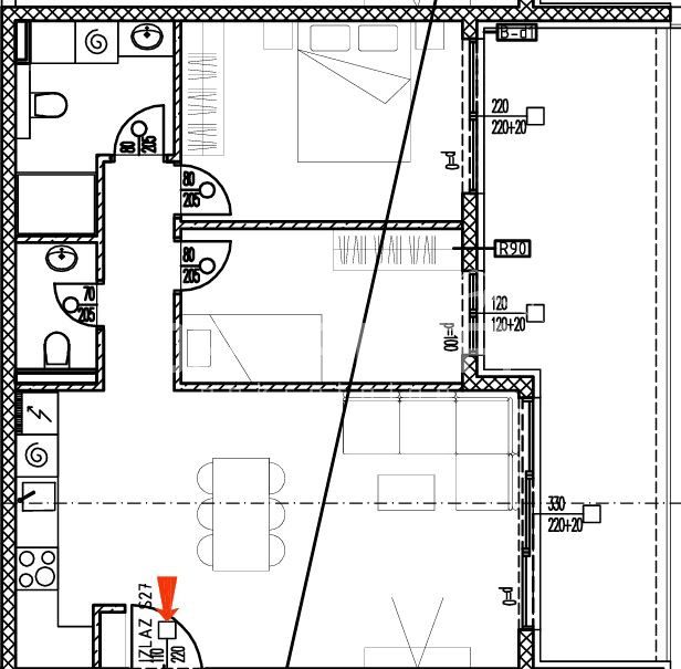 Sastoji se od: hodnika, kuhinje+blagavaonica+dnevni boravak, 2 spavaće sobe, kupaonice, zasebnog toaleta i prostrane lođe od 20,53m2 (koef. 0,75=15,40m2). Dodatno, u cijenu stana uključena je i krovna terasa koja se prostire na 101,87m2 (koef. 0,25=25,47m2).