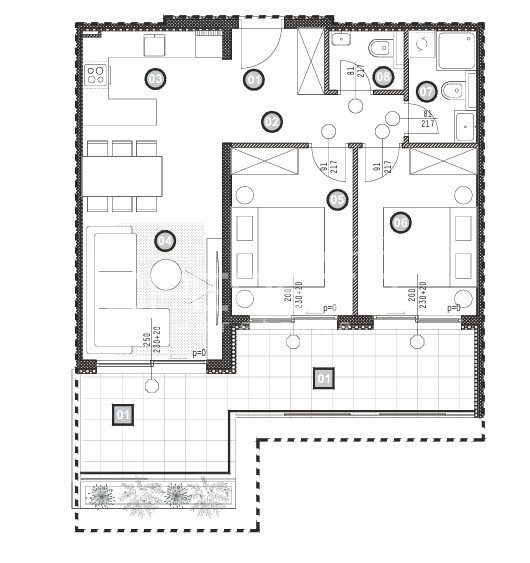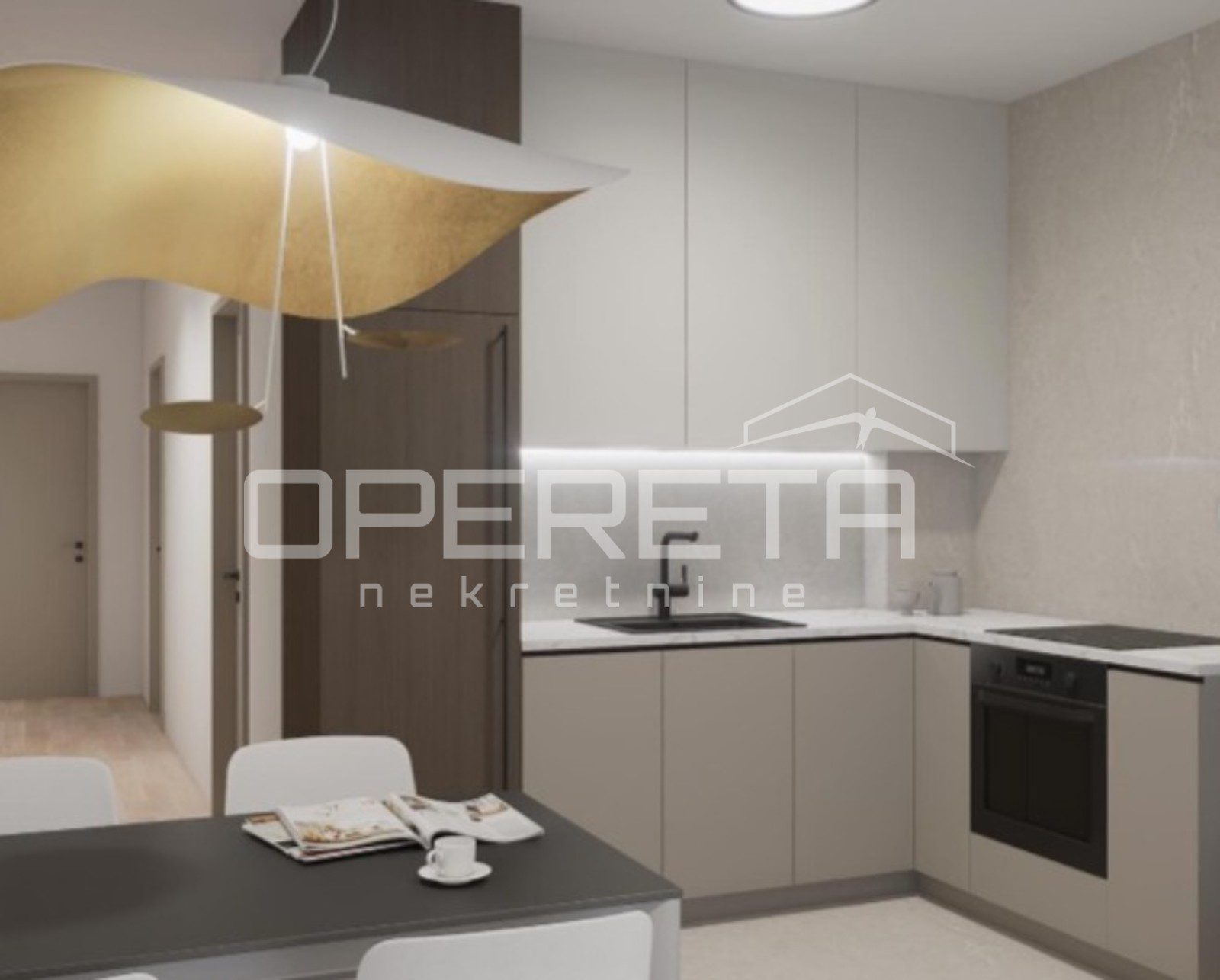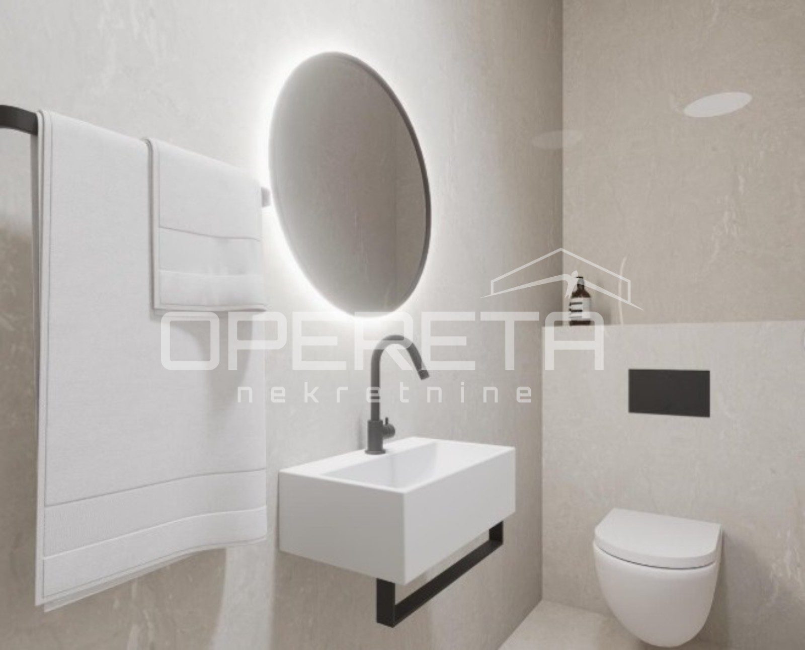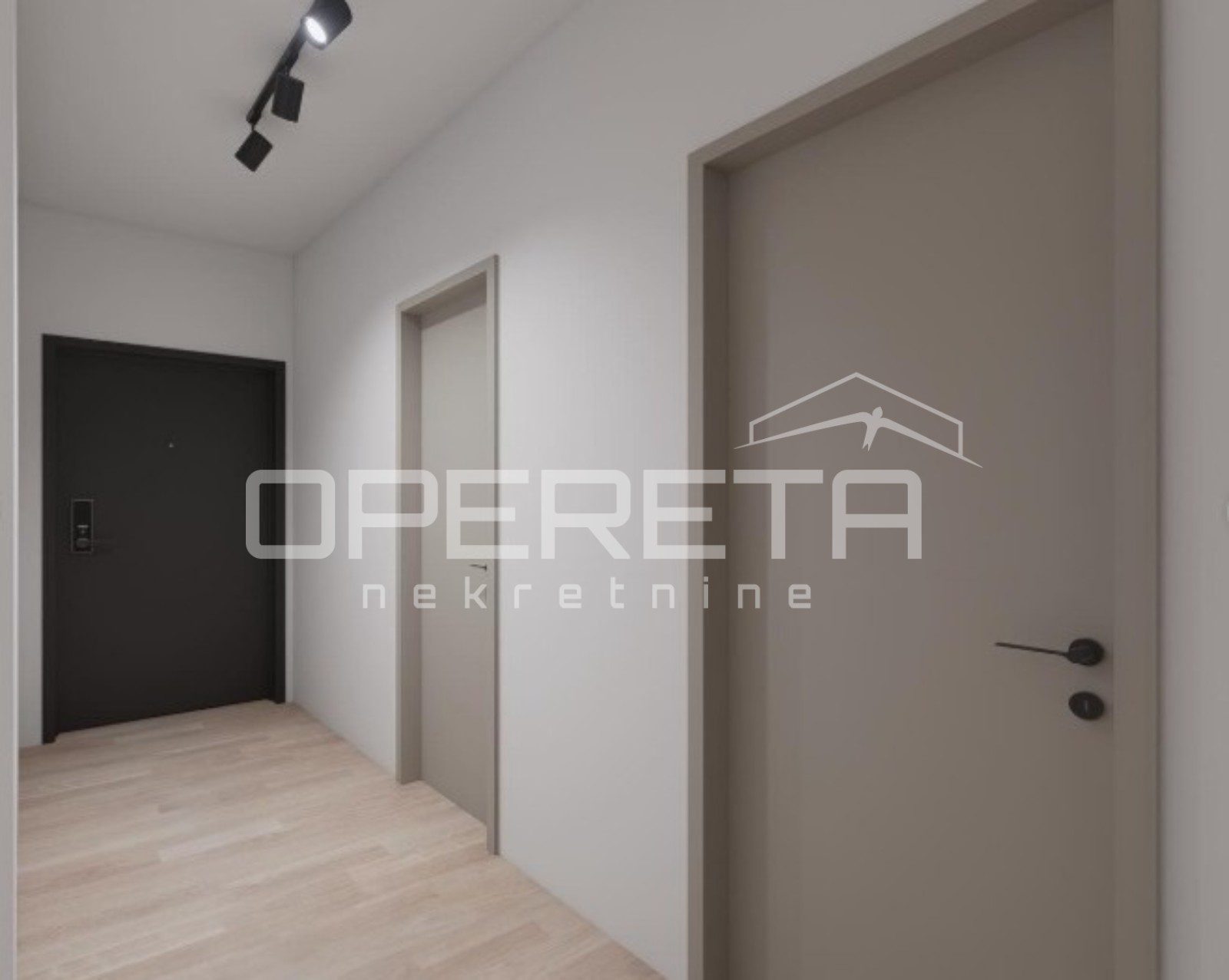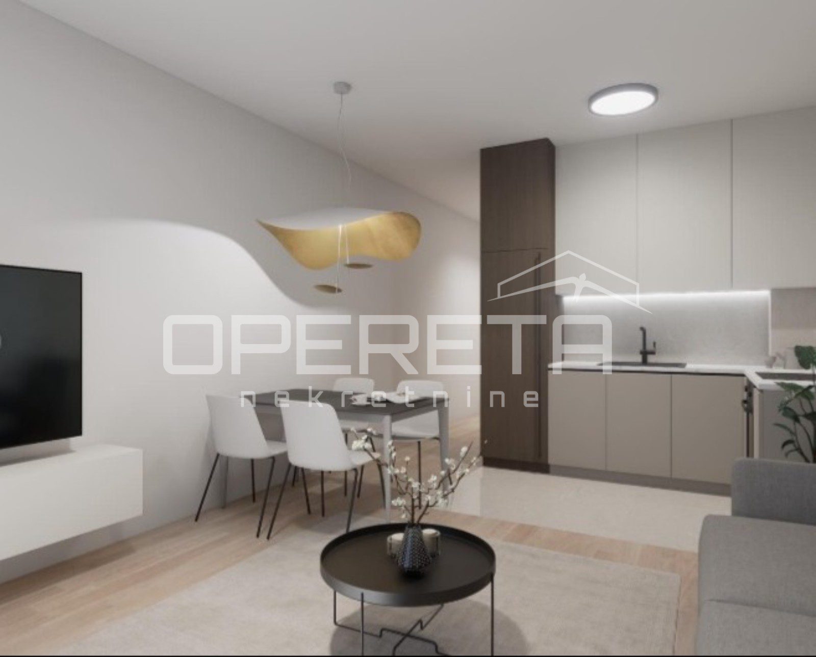 Tlocrt je promišljen i funkcionalan. Neto korisna površina iznosi 67,37 m². Ulaz vodi u svijetlu dnevnu zonu otvorenog koncepta u kojoj se kuhinja, blagovaonica i dnevni boravak logično nadovezuju i orijentirani su prema zapadu i jugu, što osigurava obilje prirodnog svjetla. Dvije komforne spavaće sobe smještene su u mirnijem dijelu stana, a raspored kupaonice i dodatnog toaleta podiže svakodnevnu funkcionalnost i privatnost.
