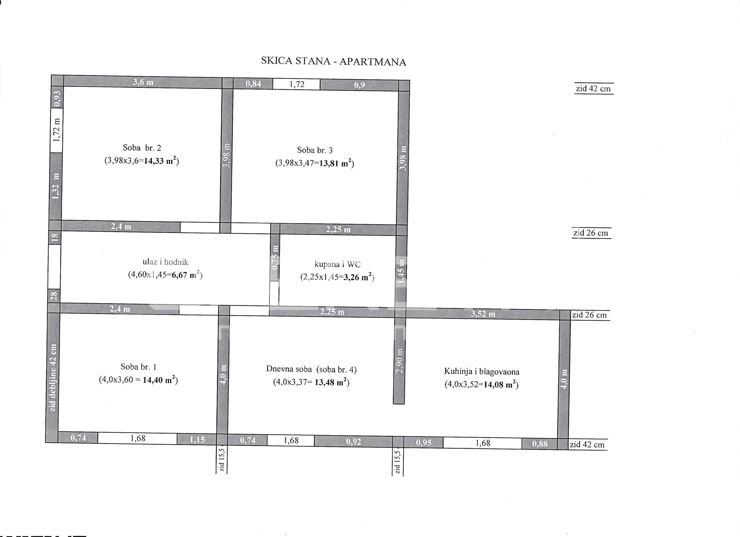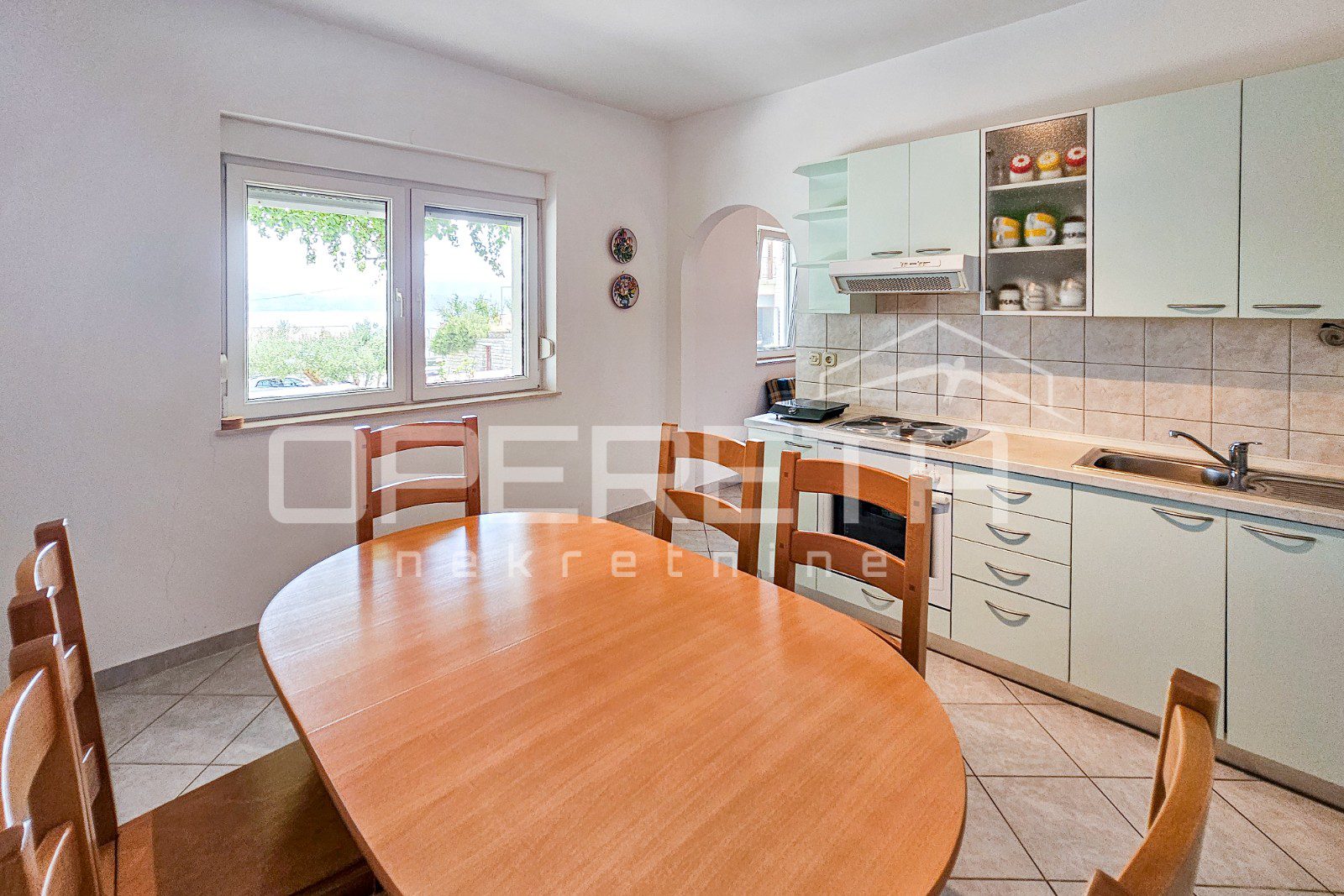 Stan ukupne površine 80m2 ima zasebni ulaz i sastoji se od ulaznog hodnika, kupaonice s toaletom, tri spavaće sobe, kuhinje povezane s blagovaonicom te dnevnog boravka. Funkcionalan raspored prostora čini ga praktičnim za obiteljski život, ali i kao idealno rješenje za odmor ili turistički najam.