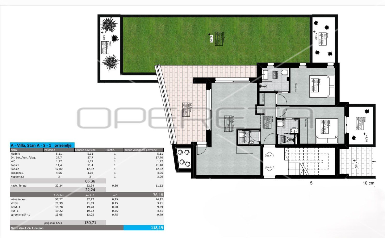 Bruto kvadratura stana uključuje (stambeni dio, vrt, natkrivenu terasu, spremište i parkirno i garažno mjesto) te iznosi: 225,67m2