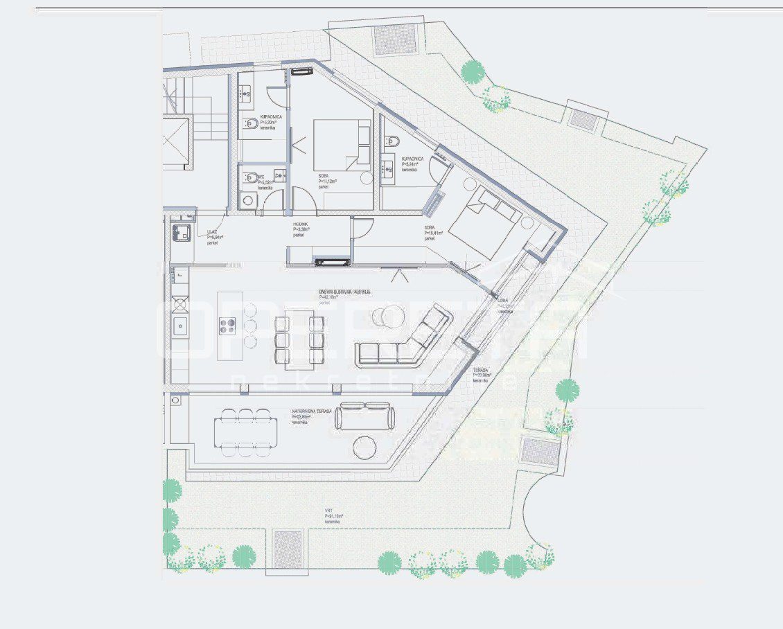 Stan se sastoji od ulaznog hodnika, gostinjskog WC-a, dvije spavaće sobe , svaka s vlastitom kupaonicom – dnevnog boravka s kuhinjom i blagovaonicom otvorenog tipa, natkrivene i nenatkrivene terase, te pripadajućeg vrta koji dodatno obogaćuje životni prostor i pruža osjećaj privatnosti.