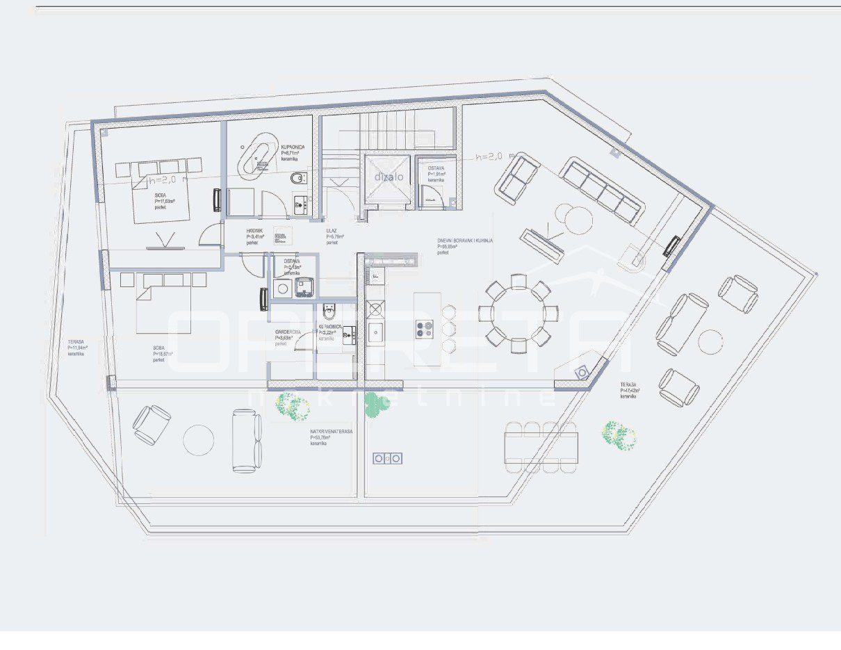 Tlocrtno, stan se sastoji od prostranog open-space dnevnog boravka s blagovaonicom i kuhinjom, dvije udobne spavaće sobe – od kojih glavna ima vlastitu kupaonicu – dodatne kupaonice i spremišta. Sve glavne prostorije imaju direktan izlaz na veliku privatnu terasu, čime se prostor dodatno otvara i povezuje s vanjskim okruženjem.