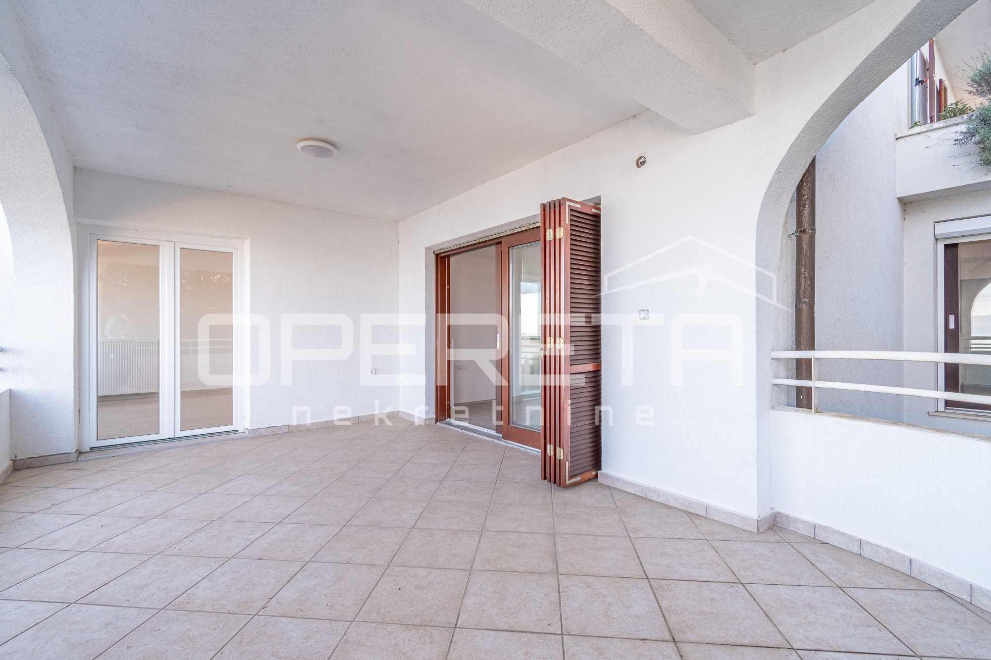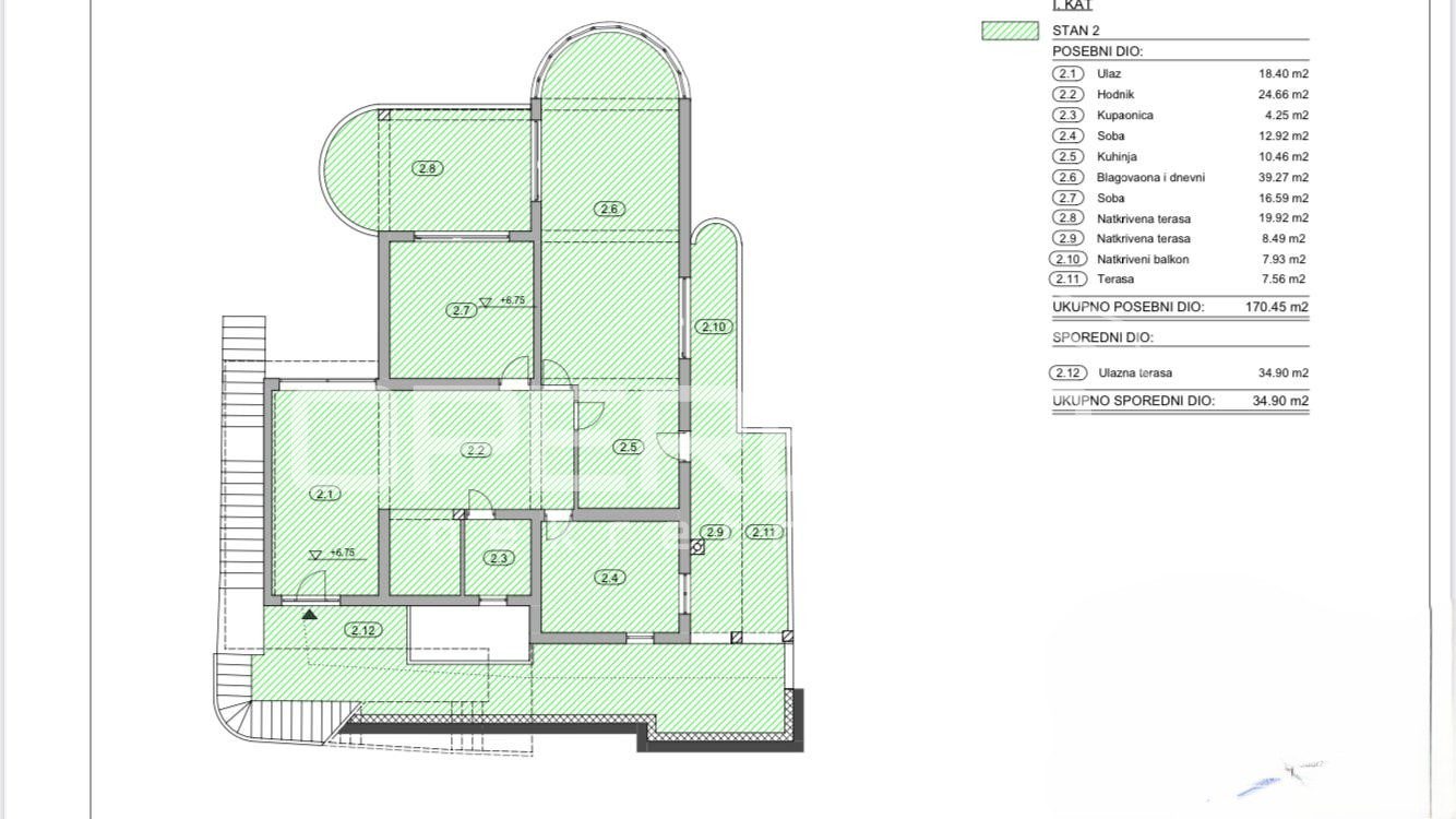 Stan se sastoji od ulaza, hodnika, kupaonice, dvije sobe, kuhinje, blagavaonice i dnevnog boravka, dvije natkrivene terase, natkrivenog balkona i nenatkrivene terase na 1. katu, ukupne površine 170,45 m2, kojem pripada kao sporedni dio ulazna terasa površine 34,90 m2 na 1.katu, te pripadak parking mjesto površine 12,50 m2, sveukupne površine 217,85 m2