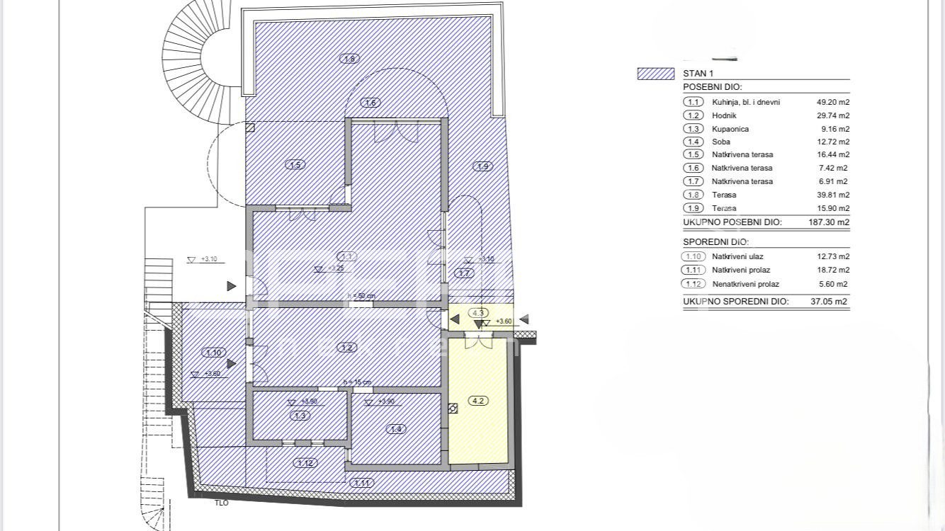 Stan se nalazi u suterenu i prizemlju, koji se sastoji od kuhinje s blagovaonicom i dnevnim boravkom, hodnika, kupaonice, sobe, tri natkrivene terase i dvije nenatkrivene terase u prizemlju, ukupne površine 187,30 m2, kojem pripada kao sporedni dio natkriveni ulaz površine 12,73 m2 u prizemlju, natkriveni prolaz površine 18,72 m2 u prizemlju i nenatkriveni prolaz površine 5,60 m2, u prizemlju,