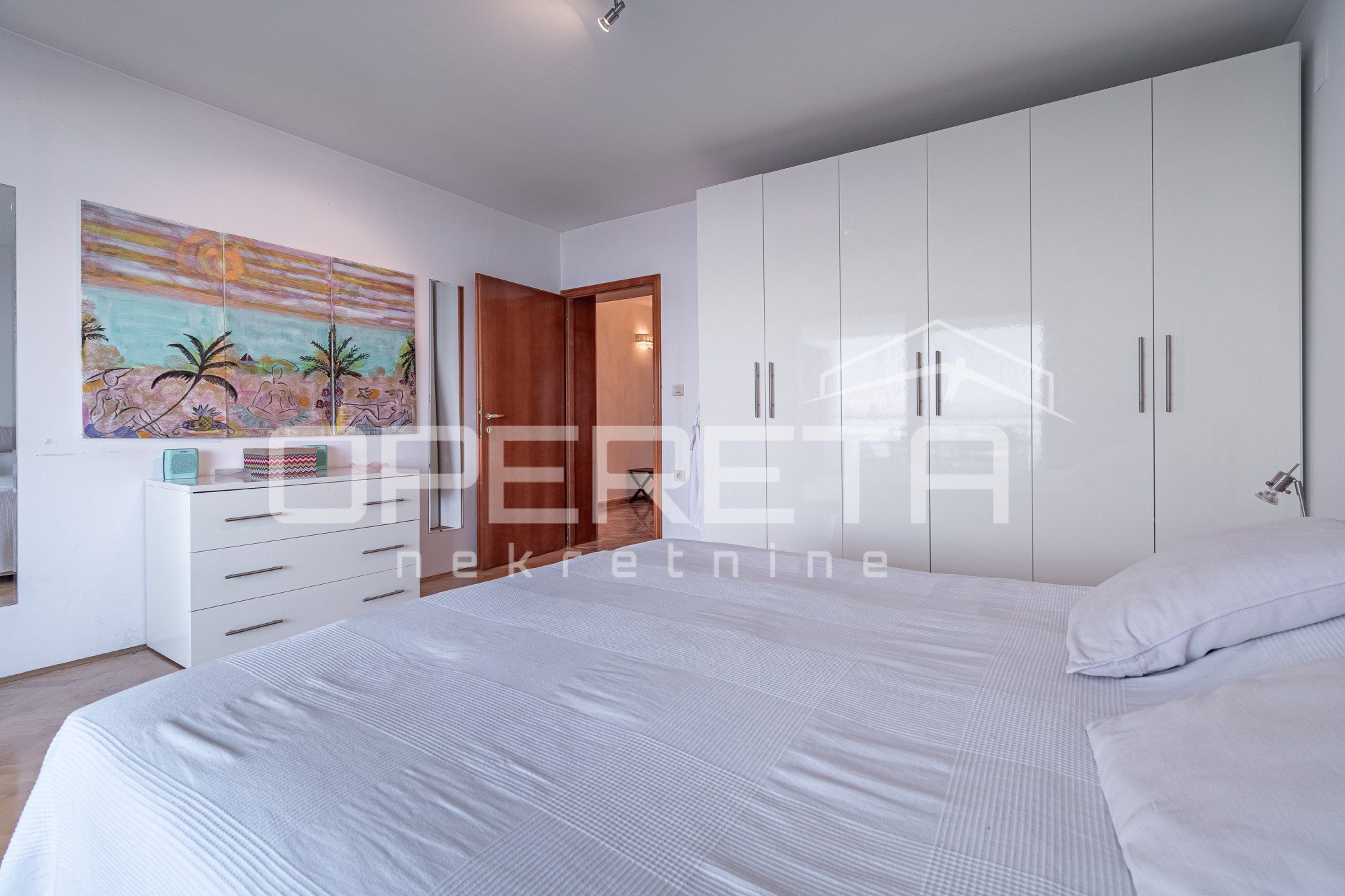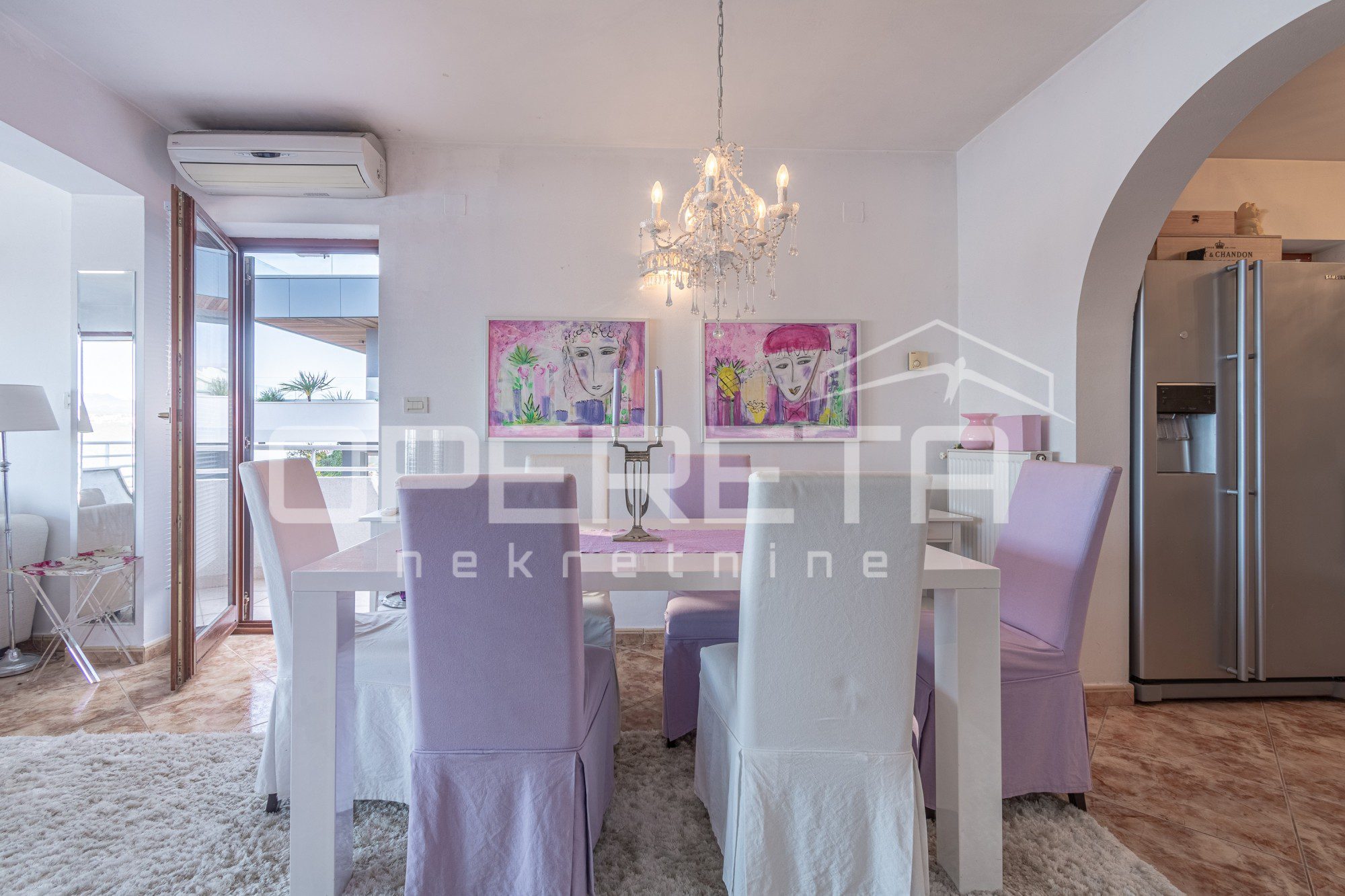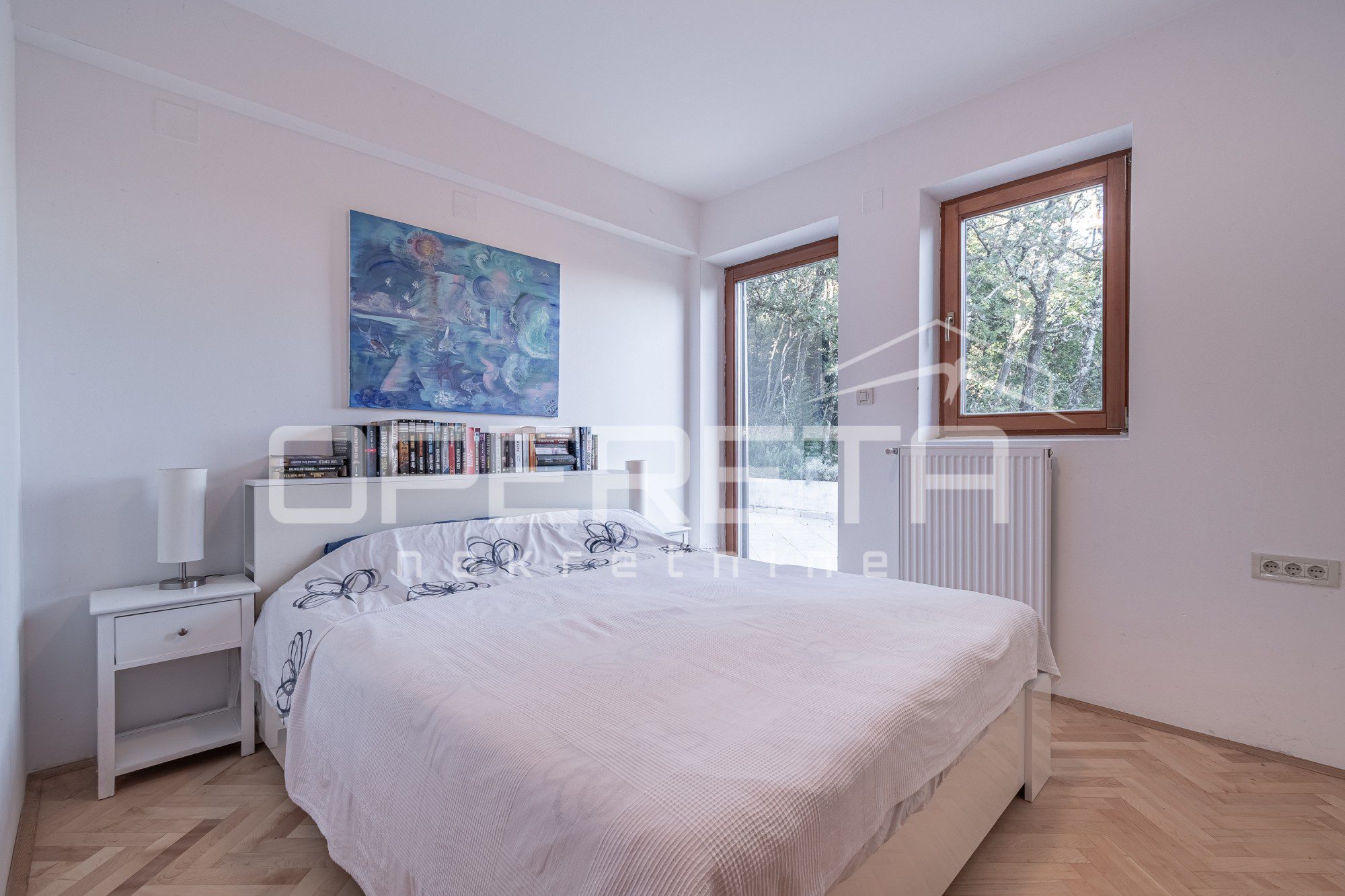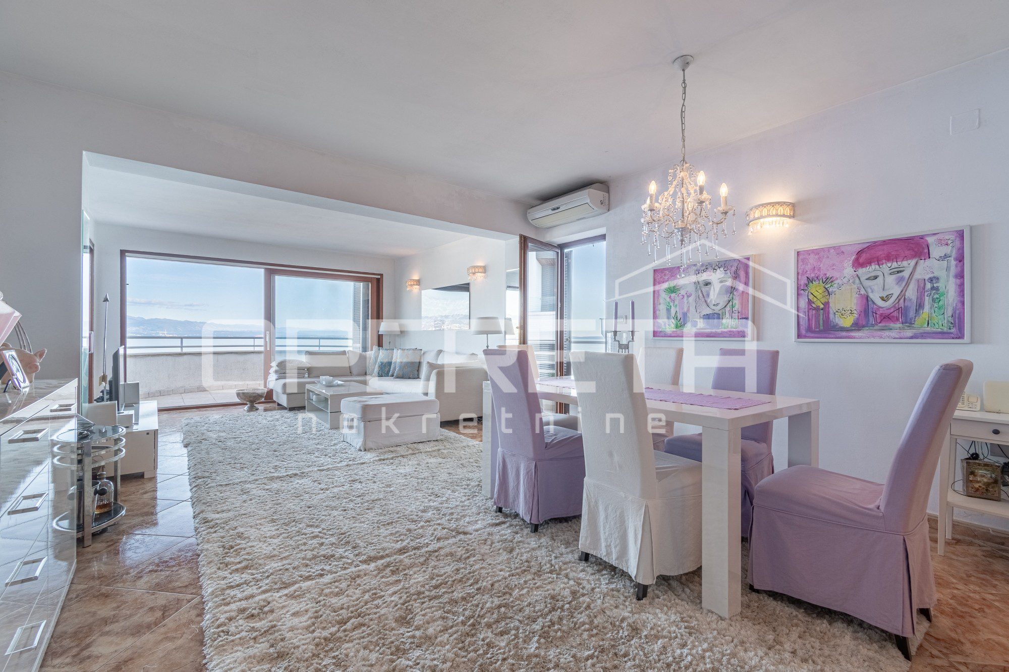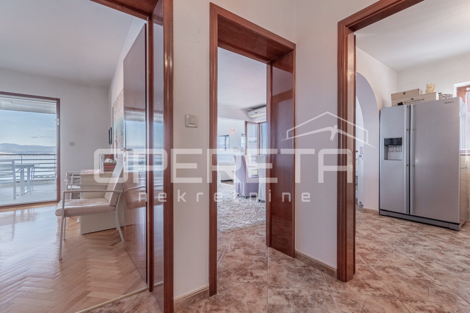 Na mirnoj lokaciji okruženoj zelenilom, svega 300 metara od mora i centra Opatije, prodaje se prostrani dvoetažni stan s panoramskim pogledom na Kvarner. Stan ukupne površine 306,95 m² (obračunske neto površine 224,22 m²) smješten je na drugom katu i potkrovlju manje vile s tri stambene jedinice.