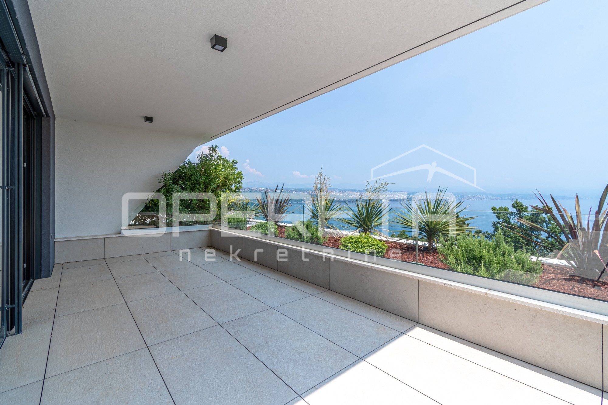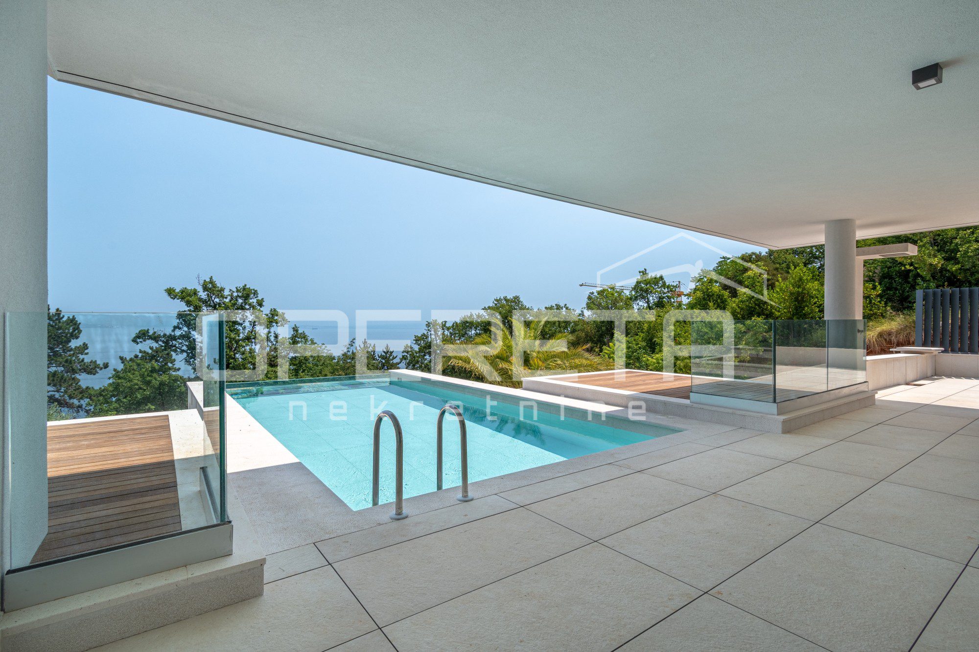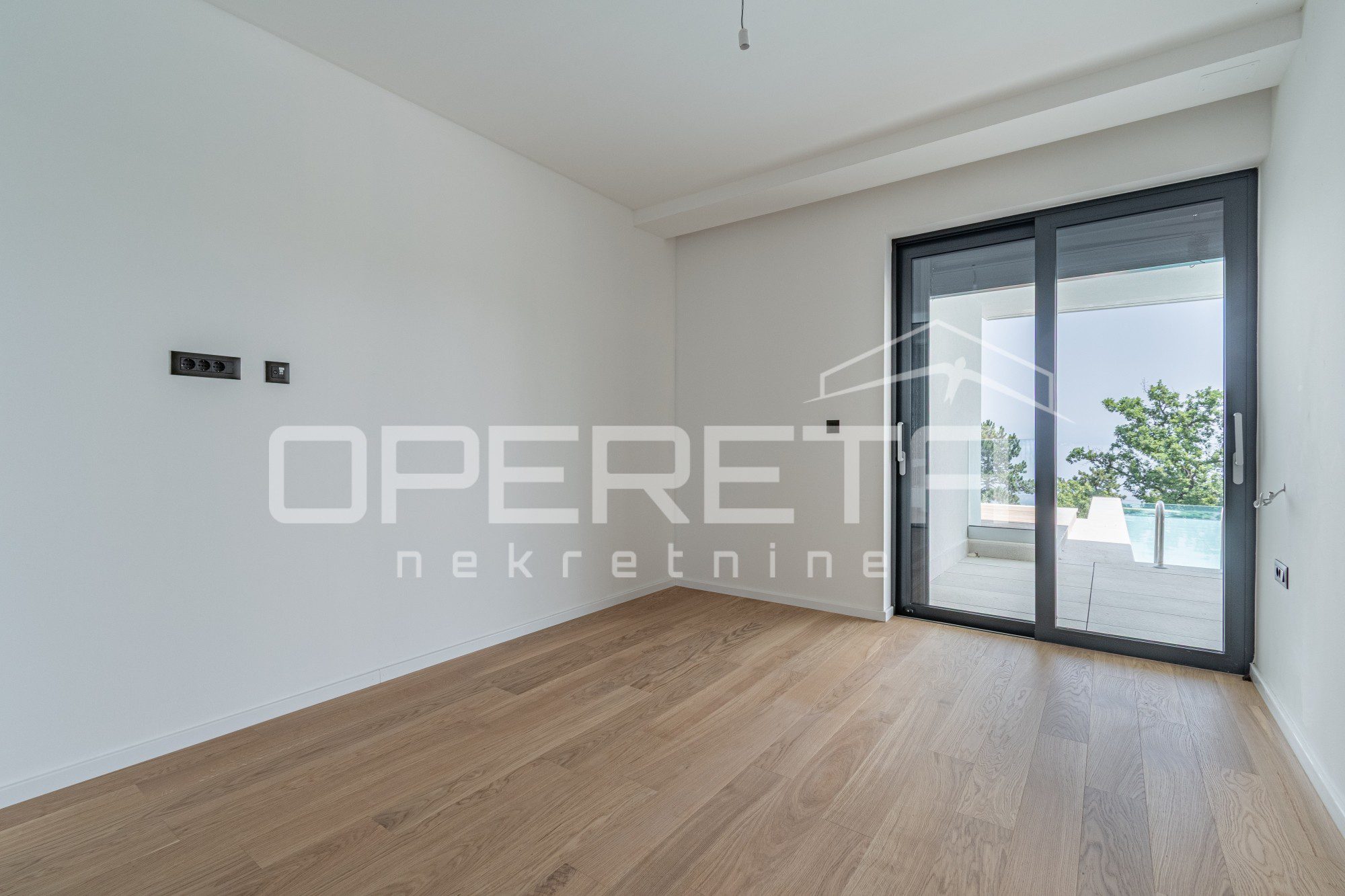 Vanjski prostor dodatno obogaćuje kvalitetu života: natkrivene i nenatkrivene terase i balkoni ukupne površine 45,91 m², kao i privatna okućnica površine 112 m², savršena za opuštanje i boravak na otvorenom. Poseban dragulj ove nekretnine je grijani bazen s protustrujnim sustavom veličine 22 m², okružen sunčalištem i bujnom mediteranskom vegetacijom, što stvara osjećaj vlastite oaze mira.