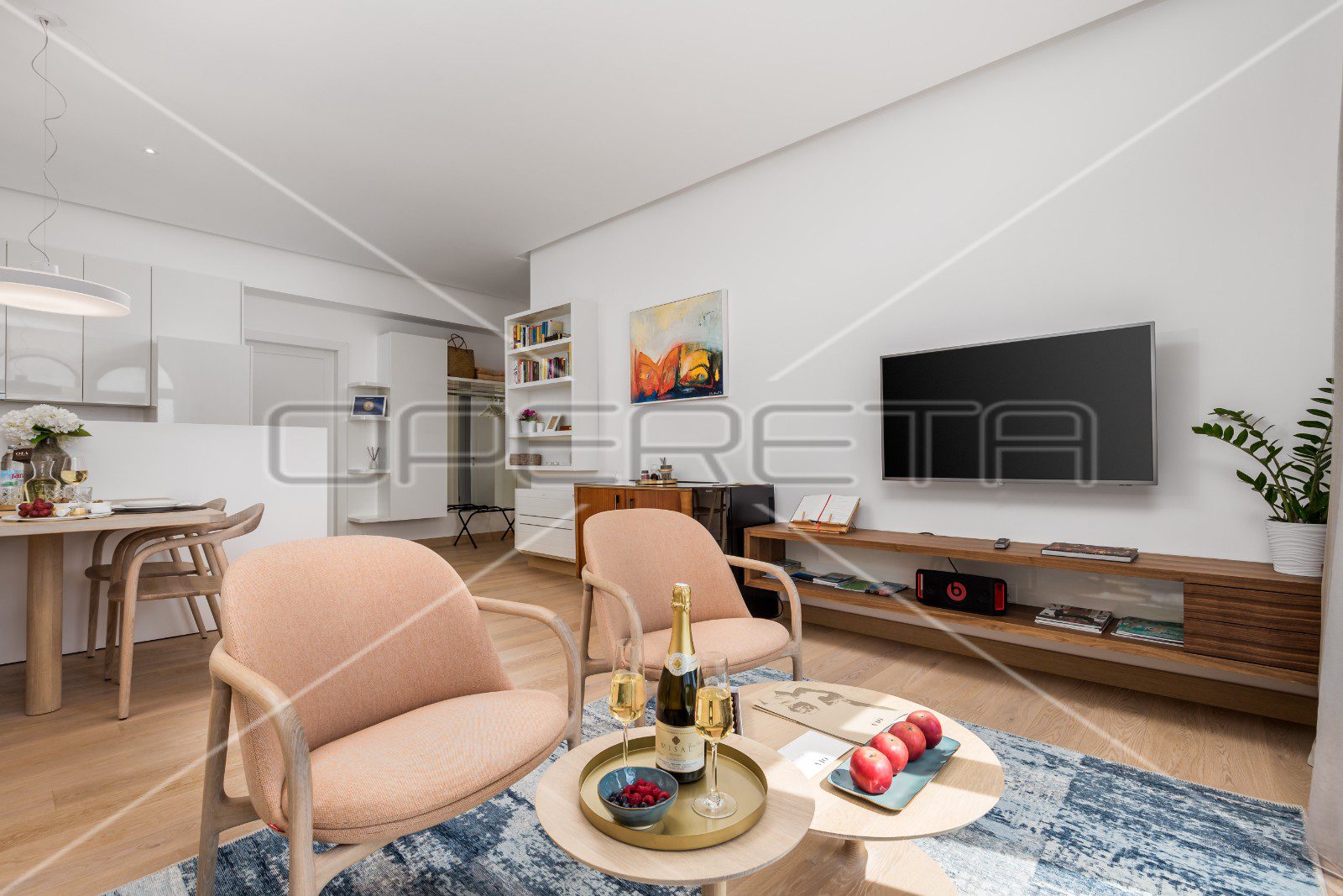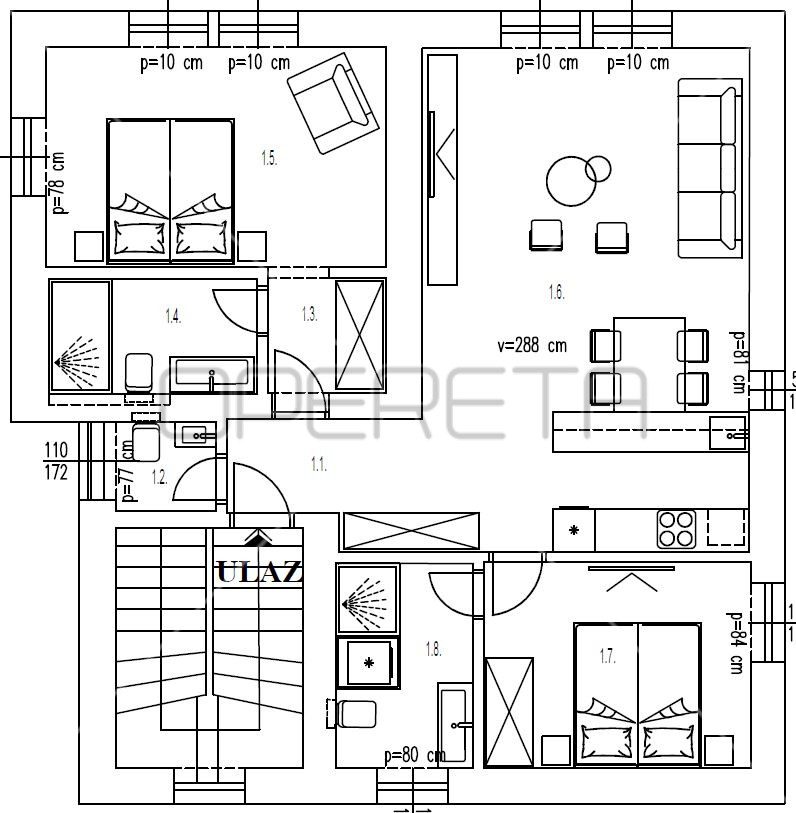 Nedavno kompletno adaptiran, apartman spaja povijesni šarm s modernom funkcionalnošću i udobnošću. Centralni dio stana čini prostrani open space, koji uključuje dnevni boravak, kuhinju i blagovaonicu. Prostor je dobro opremljen i namješten, osmišljen za ugodan život i druženje. U stanu se nalazi i dodatni gostinjski WC, kao i praktičan radni kutak u master spavaćoj sobi.