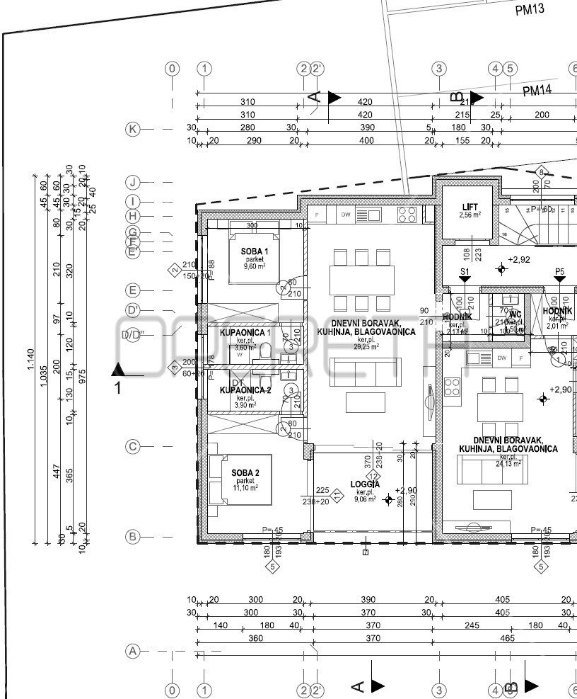 Stan je smješten na 1. katu s prodajnom površinom od 80,61 m2 (103,07 m2 bruto). Sastoji se od dvije spavaće sobe, otvorenog dnevnog boravka i kuhinje, dvije kupaonice i lođe od 11 m2.