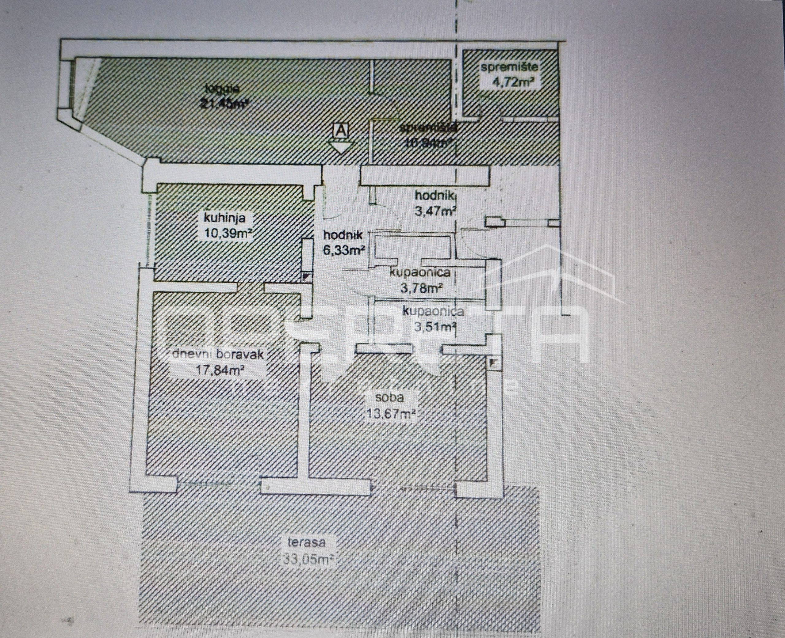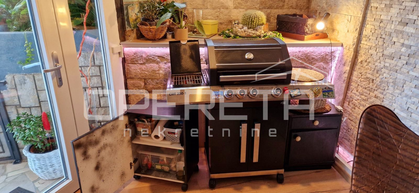 Stan se sastoji od dva hodnika, kuhinje, dnevnog boravka, jedne spavaće sobe, dvije kupaonice te nenatkrivene terase, s osnovnom stambenom površinom od 67,25 m². Uz glavni stambeni prostor, stanu pripadaju i dodatni prostori: dvije spremišne prostorije i loggia u prizemlju ukupne površine 23,92 m², kao i spremište u suterenu površine 5,82 m². Sveukupna površina stana s pripadcima iznosi 96,99 m².