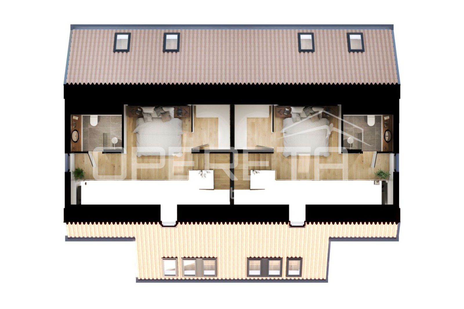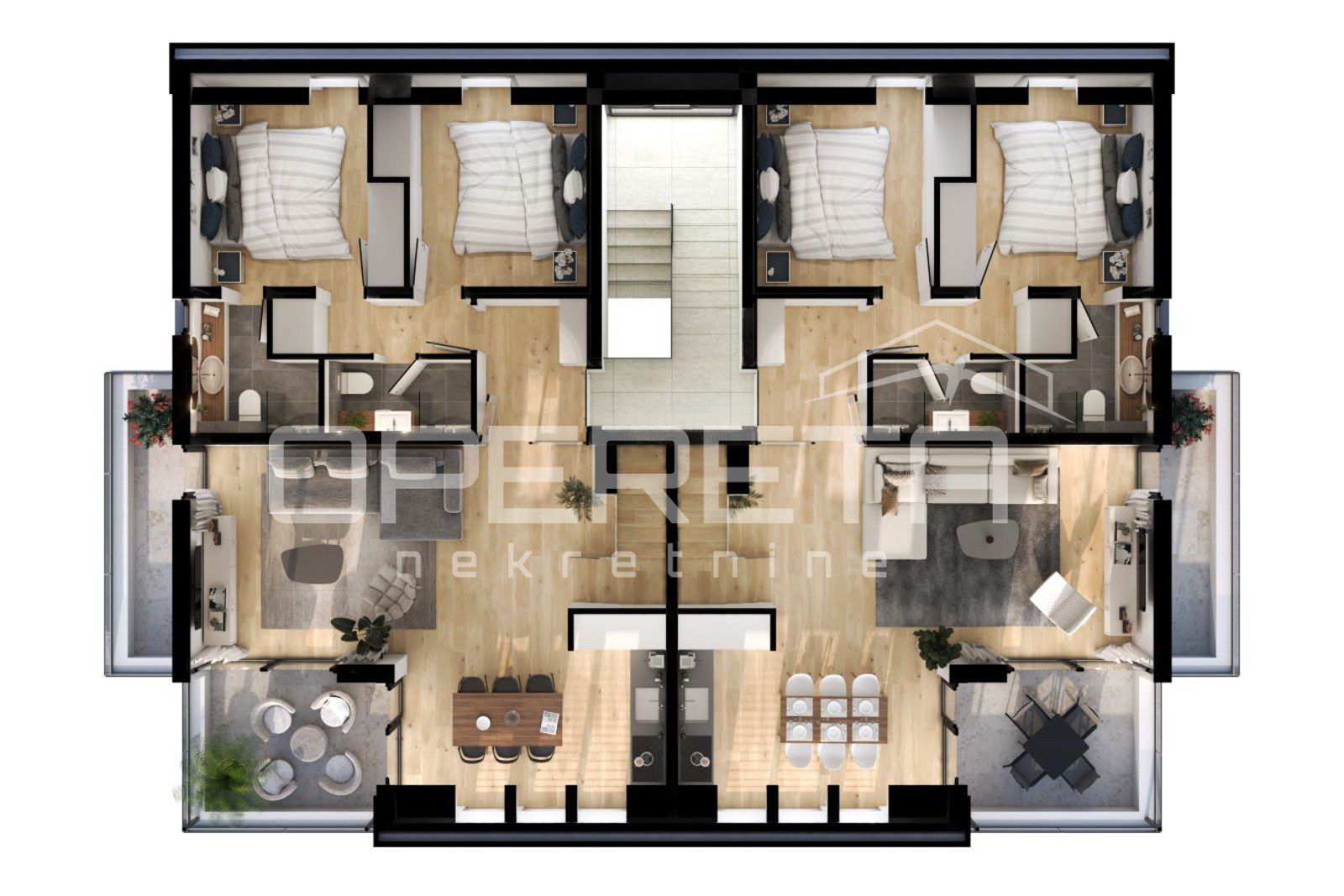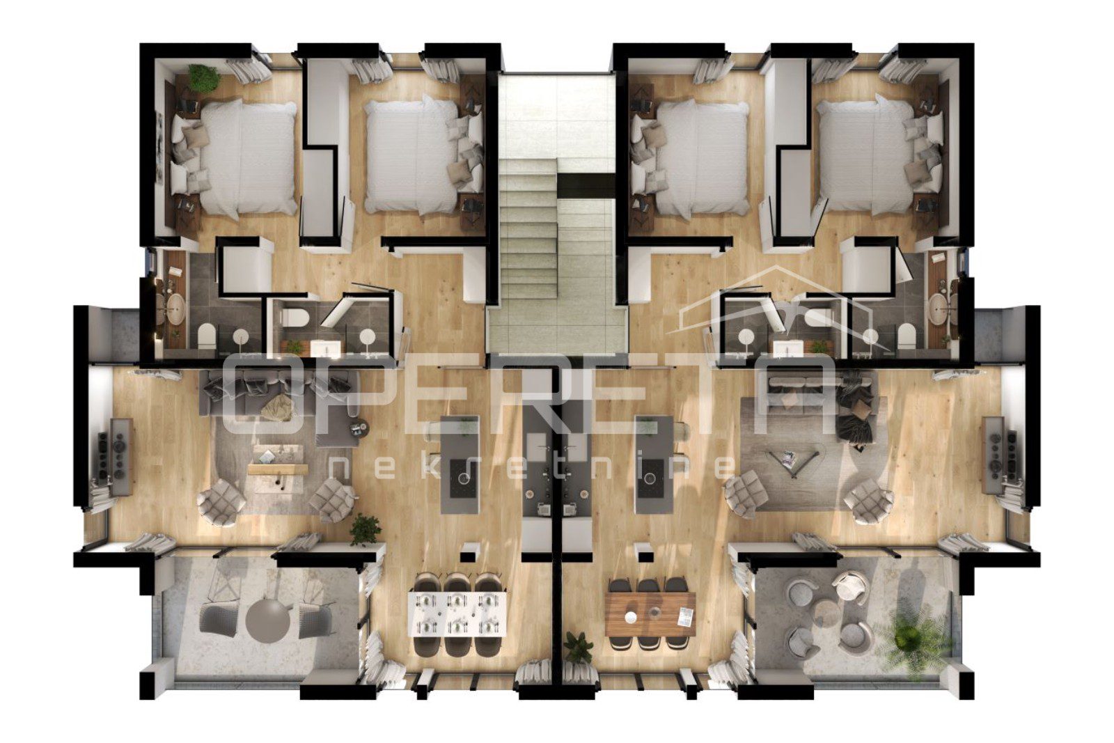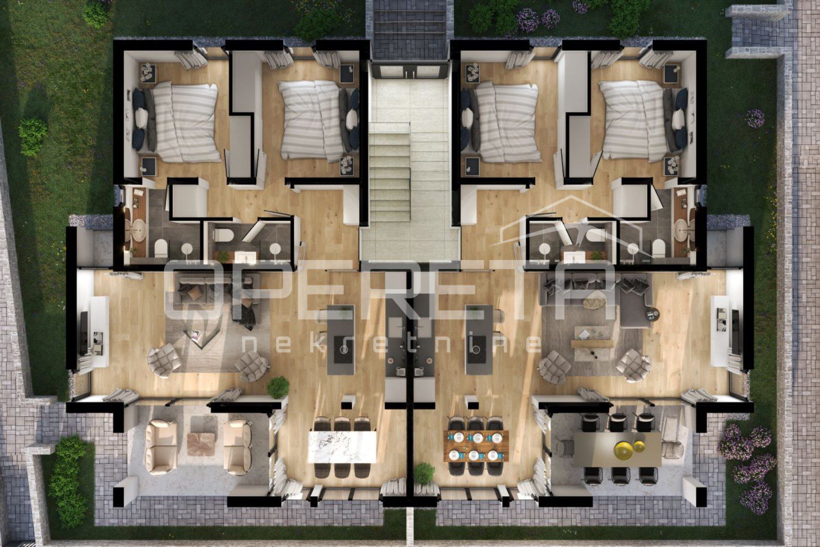 Stanari imaju na raspolaganju vlastito parkirno mjesto, a kvaliteta gradnje vidljiva je u svakom detalju – od napredne toplinske i zvučne izolacije, aluminijske stolarije s modernim kliznim sustavima, podnog grijanja do estetski oblikovanog eksterijera. Vanjski prostor oplemenjen je mediteranskim biljem, automatskim navodnjavanjem i diskretnom večernjom rasvjetom.