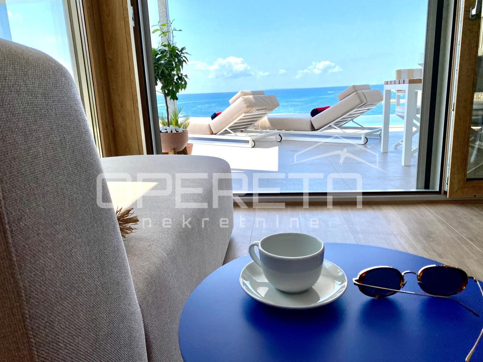 Ukupna površina stana sa svim pripadcima je 185 m², dok ukupna neto stambena površina iznosi 85 m². Raspored uključuje hodnik, dvije spavaće sobe, kupaonicu, dodatni WC te prostrani open-space dnevni boravak s kuhinjom i blagovaonicom. Iz dnevnog prostora izlazi se na veliku terasu s grijanim infinity bazenom i spektakularnim, otvorenim pogledom na more.