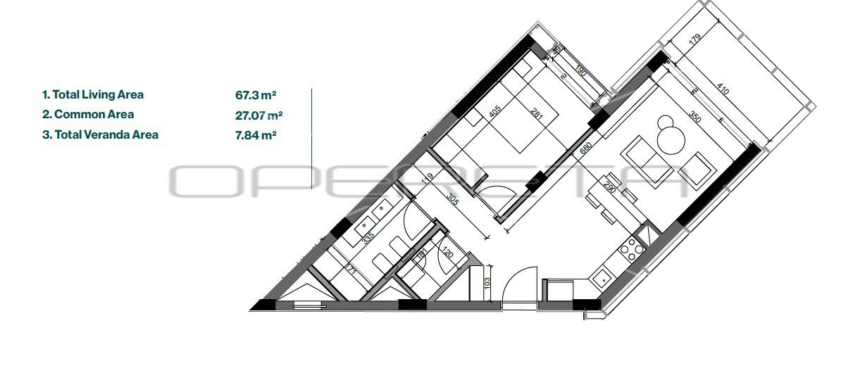 Luksuzni apartman iz naše ponude sastoji se od dnevnog boravka sa kuhinjom, spavaće sobe, kupaonice, vešeraja i verande. Ukupna stambena površina apartmana je 67,3 m2, zajednički prostor 27,07 m2, površina verande 7,84 m2.