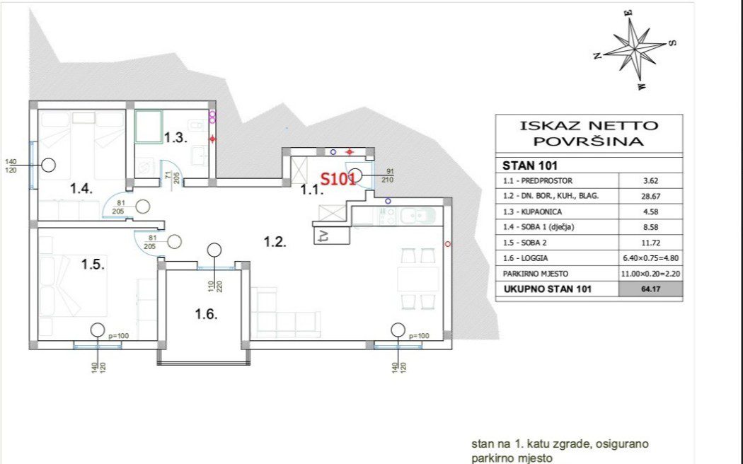 Dvosoban stan od 64,17m² (master spavaća i dječja spavaća)