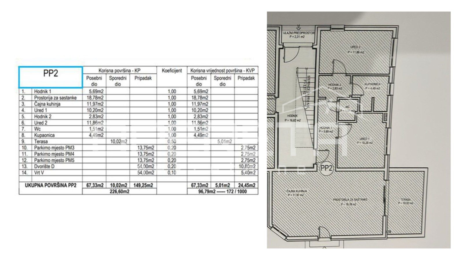 Ukupna korisna površina sa svim pripadcima iznosi 227 m2, dok je neto površina stana 97 m2.