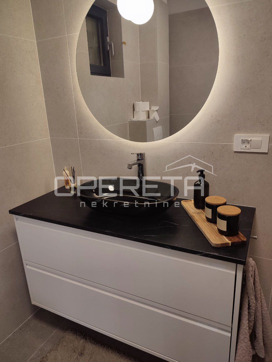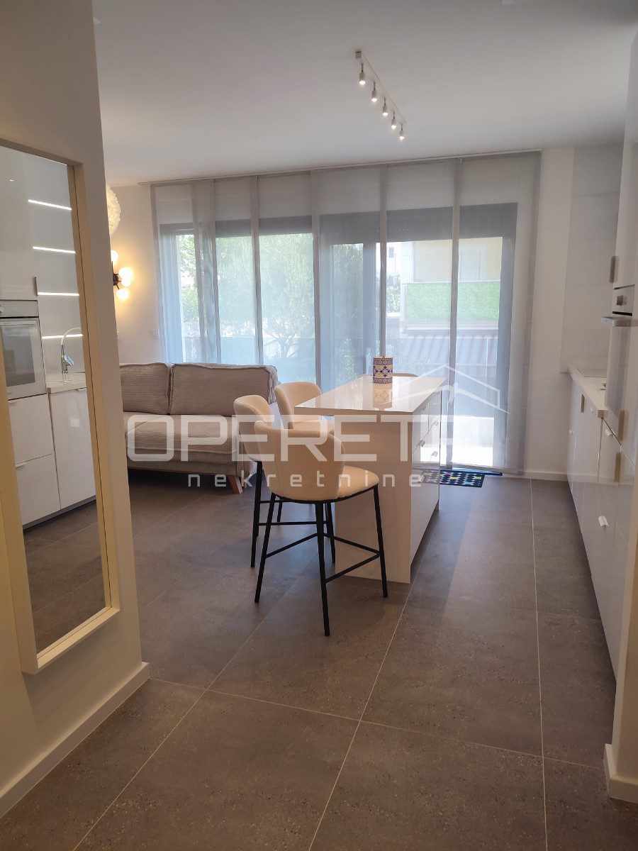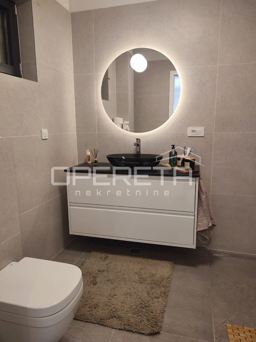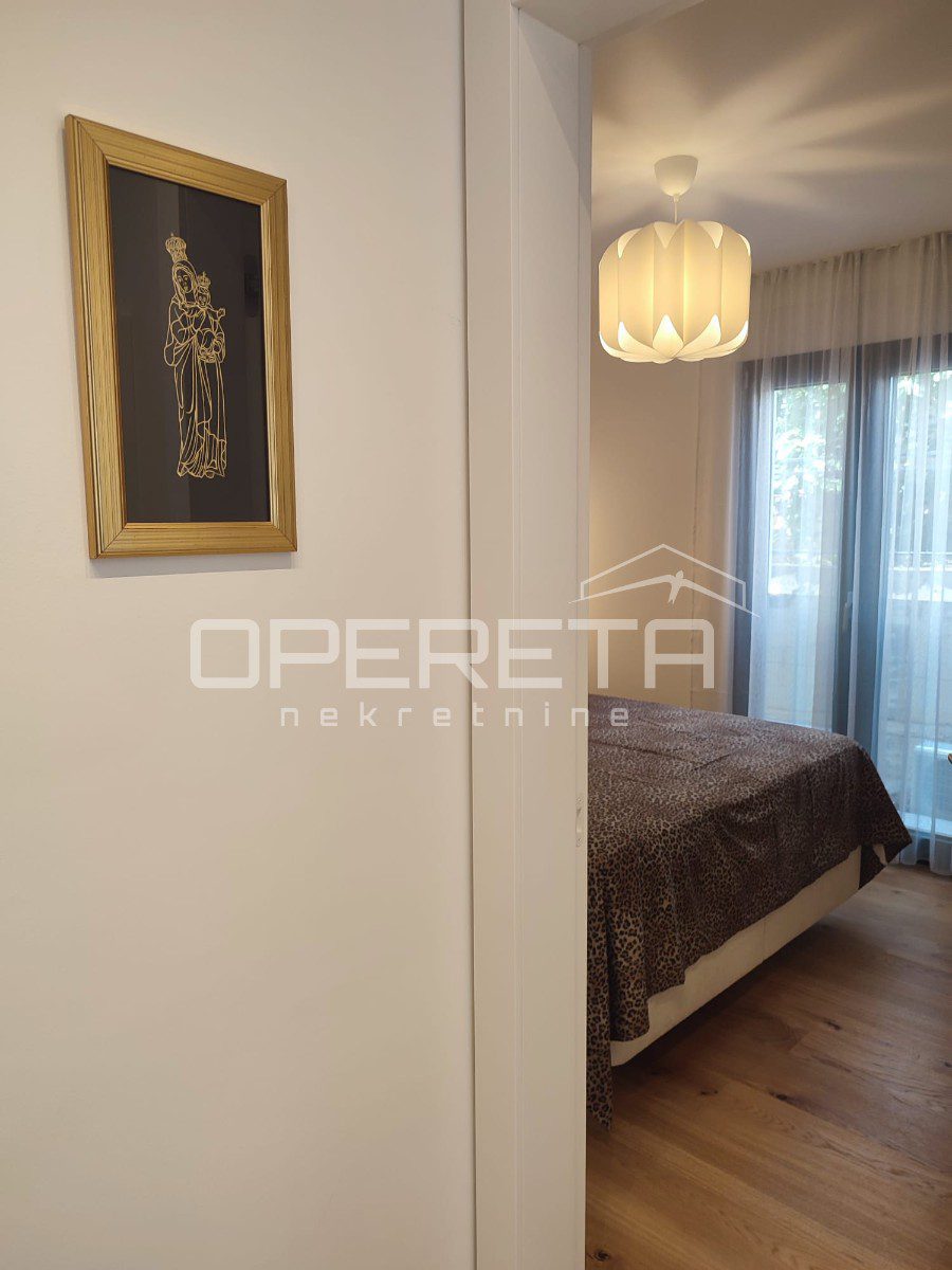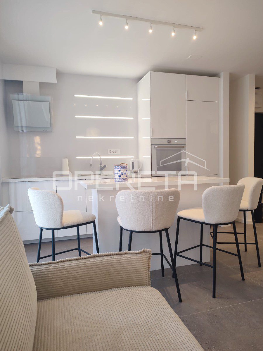 Prodaje se kompletno uređen luksuznim namještajem vrhunske kvalitete te sa podnim grijanjem u cijelom stanu (osim spavaće sobe), aluminijskim otvorima s komarnicima. Svaka prostorija je klimatizirana.