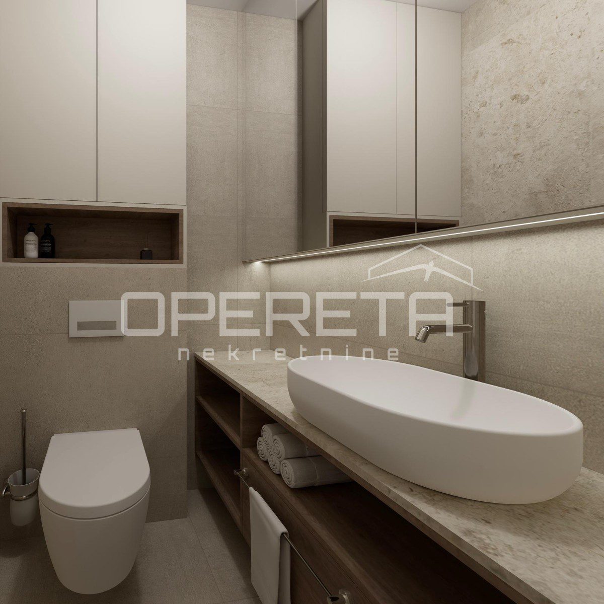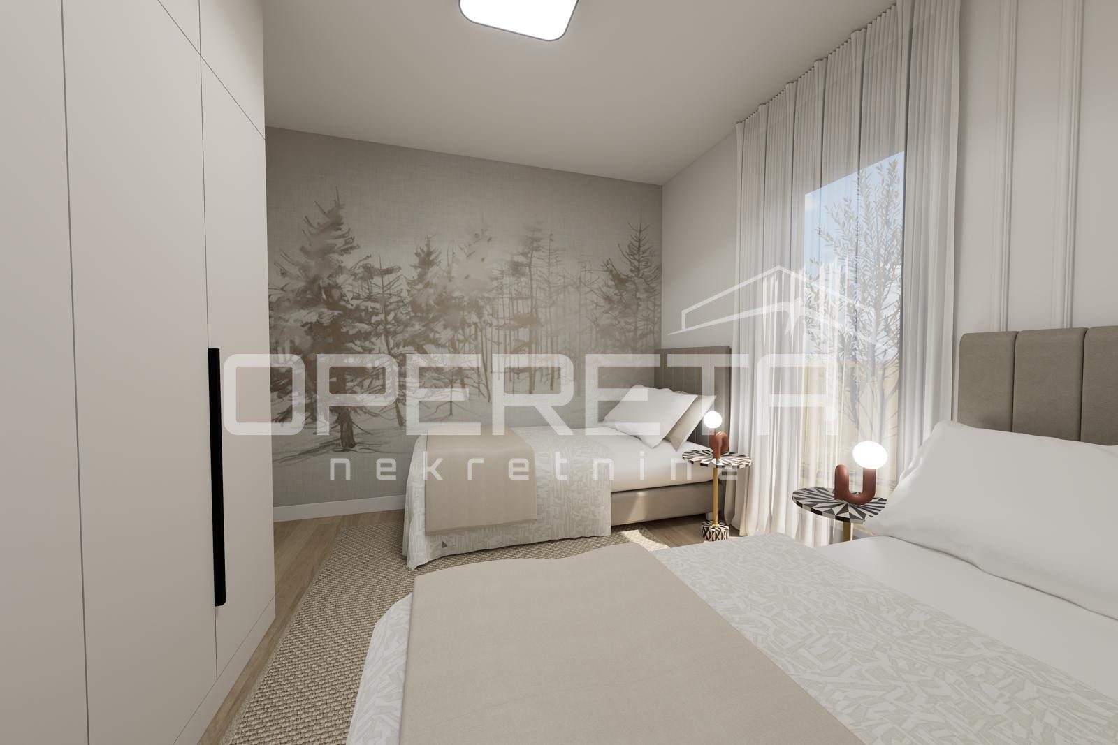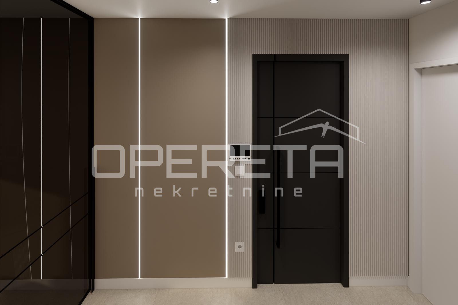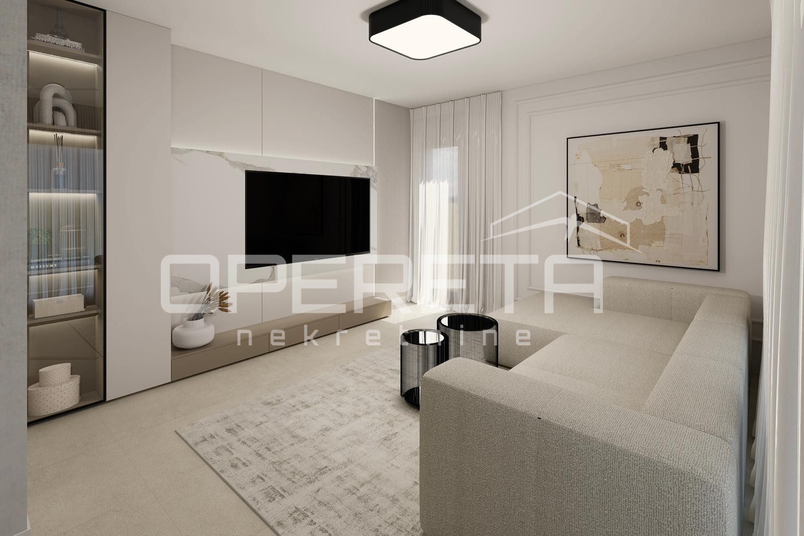 Stan se odlikuje promišljenim i praktičnim rasporedom koji spaja udobnost i suvremeni dizajn. Dnevni boravak, kuhinja i blagovaonica čine otvoren i svijetao prostor ispunjen prirodnim svjetlom, dok spavaća soba pruža mir i privatnost potrebnu za svakodnevni odmor. Unutarnji prostor prirodno se nastavlja prema balkonu, stvarajući ugodan osjećaj povezanosti s vanjskim okruženjem i mediteranskim načinom života.