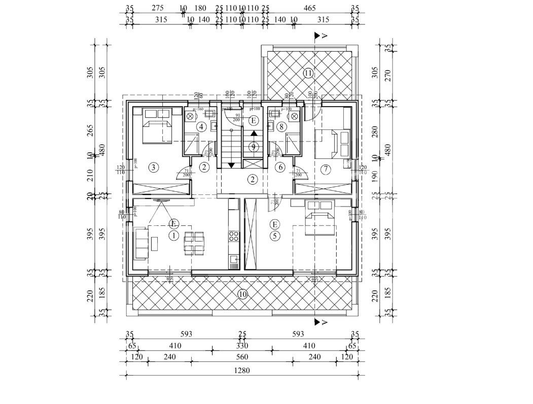 Stan se sastoji od tri spavaće sobe, dnevnog boravka, kuhinje, hodnika, kupaonice, teraseni ostave.