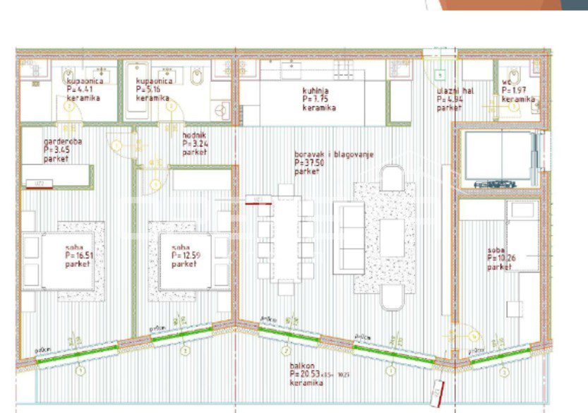 Iz naše ponude izdvajamo visoko kvalitetan stan smješten na trećem katu moderne zgrade u izgradnji, opremljene liftom. Ukupna stambena površina iznosi 128,31 m². Stan se sastoji od ulaznog hodnika, otvorenog prostora dnevnog boravka s izlazom na prostranu terasu s prekrasnim pogledom na more, kuhinje s blagovaonicom, tri spavaće sobe, od kojih svaka ima vlastiti balkon, dvije kupaonice, zasebnog WC-a, spremišta u podrumu površine 4,36 m² te garažnog parkirnog mjesta površine 15,12 m².