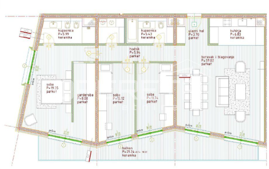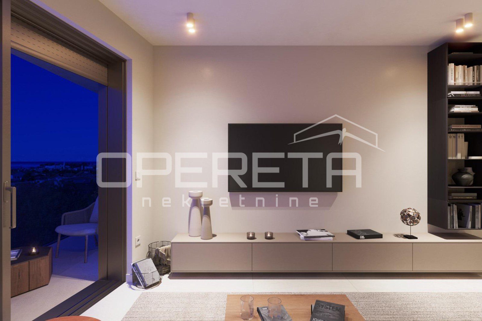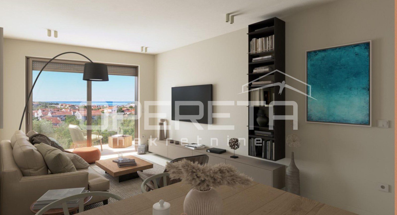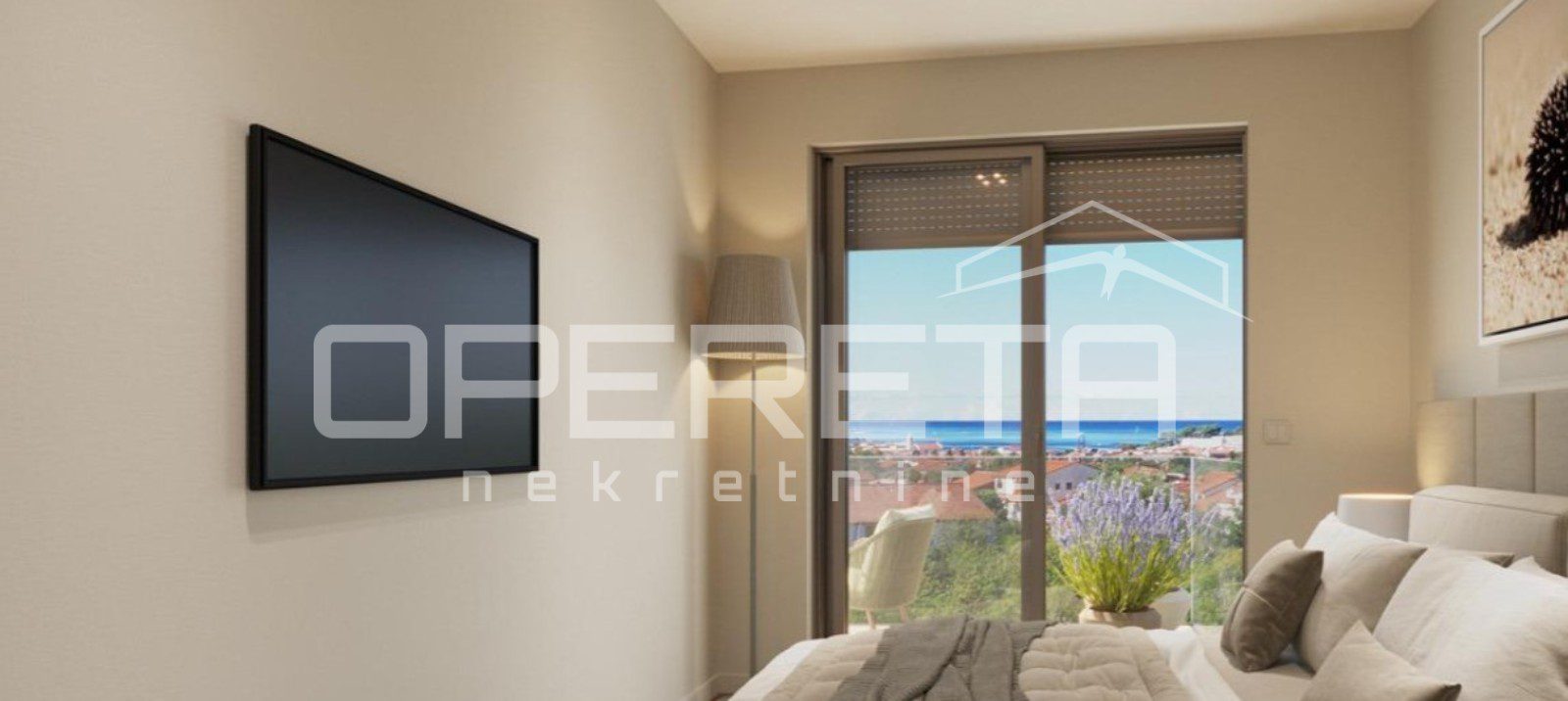 Iz naše ponude izdvajamo se visokokvalitetan stan smješten na trećem katu moderne novogradnje opremljene liftom. Ukupna stambena površina iznosi 138,44 m². Stan se sastoji od ulaznog hodnika, otvorenog dnevnog prostora koji uključuje dnevni boravak s izlazom na terasu s prekrasnim pogledom na more, kuhinju s blagovaonicom, tri spavaće sobe od kojih svaka ima vlastiti balkon, dvije kupaonice, zasebnog WC-a, spremišta u podrumu zgrade površine 5,24 m² te dva garažna parkirna mjesta ukupne površine 30 m².
