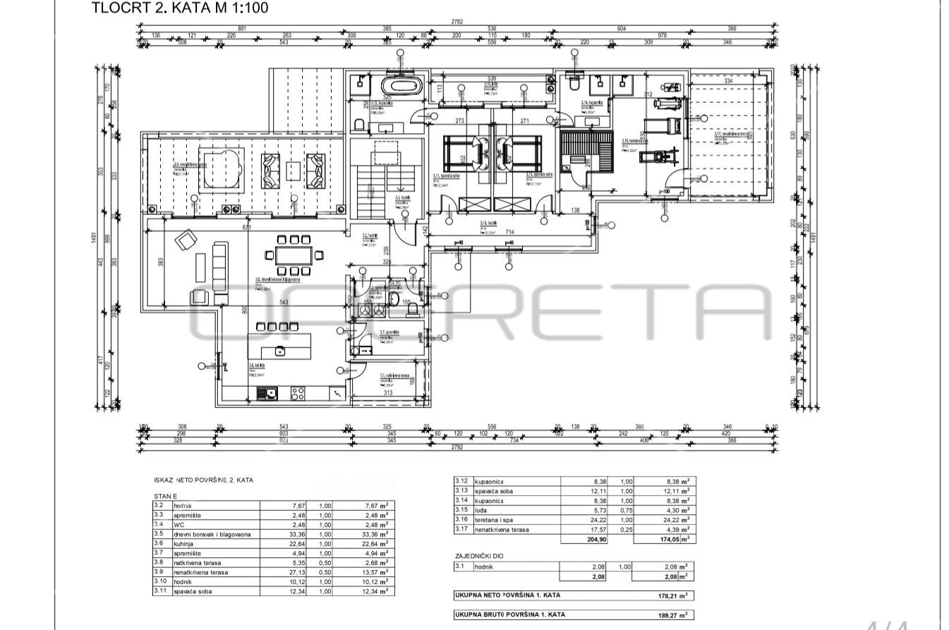 Stan A-E, smješten na drugom katu zgrade, ukupne površine 174,05m2. Sastoji se od hodnika, wc-a za goste, dvije ostave, dvije prostrane spavaće sobe te svaka posjeduje privatnu kupaonicu i izlaz na lođu, kuhinje, dnevnog boravka s blagovaonicom i teretane sa spa zonom i izlazom na prostranu terasu. Iz dnevnog boravka vodi izlaz na terasu s prekrasnim pogledom na more