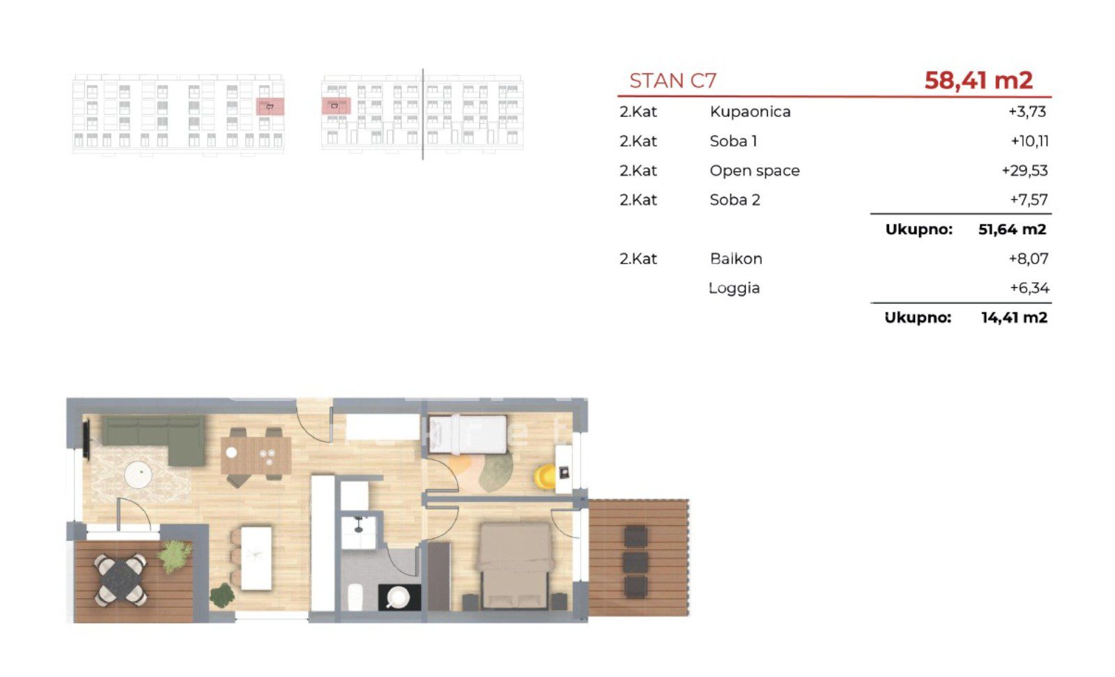 Stan se nalazi na drugom katu stambene zgrade te obuhvaća ulazni hodnik, open space prostor s kuhinjom, blagovaonicom i dnevnim boravkom koji ima izlaz na loggiu. U stanu se nalaze dvije spavaće sobe, od kojih jedna ima vlastiti izlaz na balkon, moderna kupaonica te dva parkirna mjesta koja su uključena u cijenu.