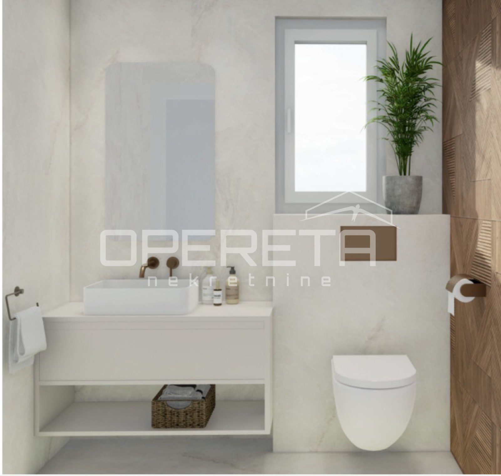 Oprema stana uključuje podno grijanje u cijelom prostoru, klima uređaj, keramiku vrhunske talijanske kvalitete te sanitarije marke Villeroy & Boch.