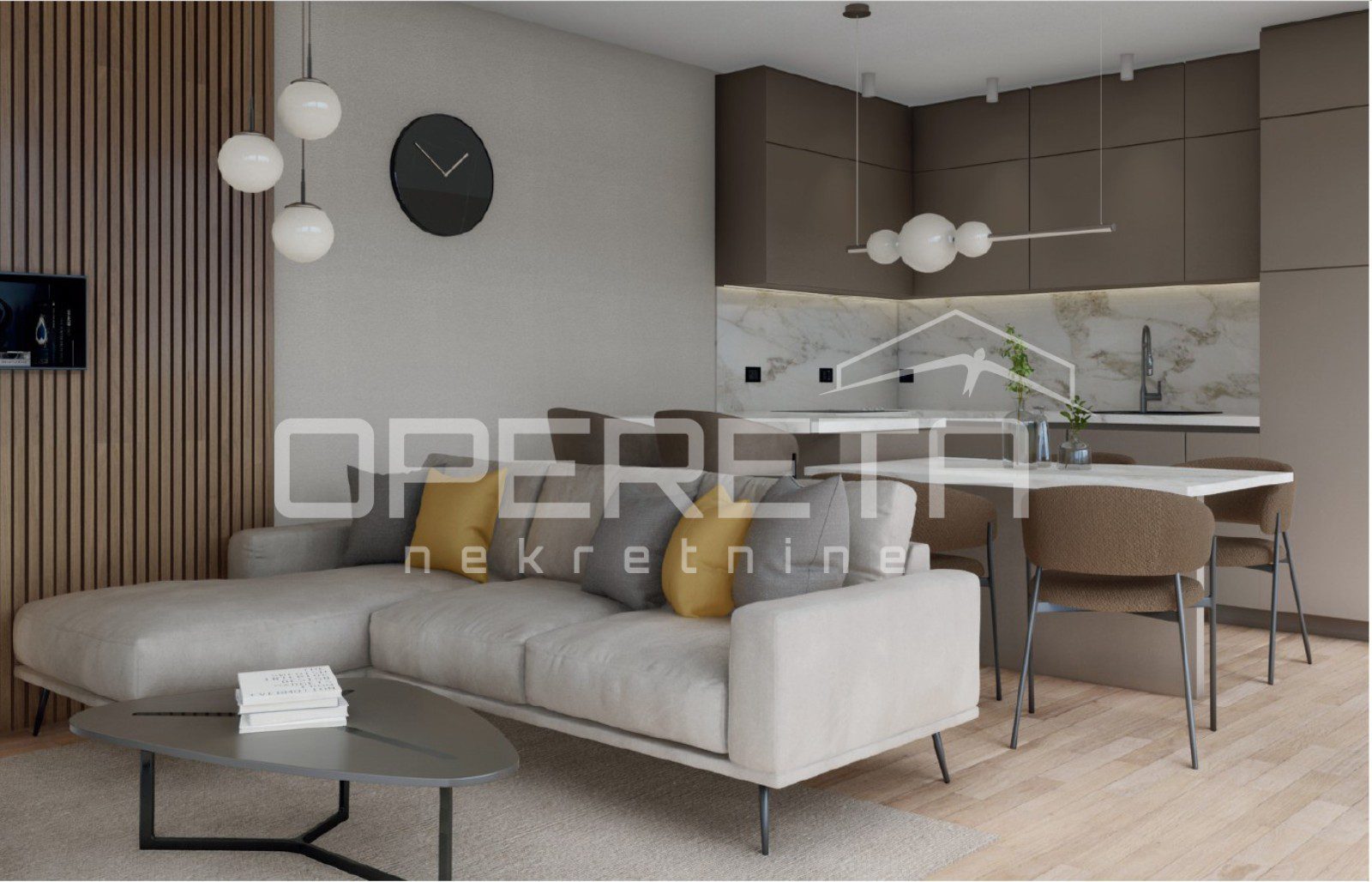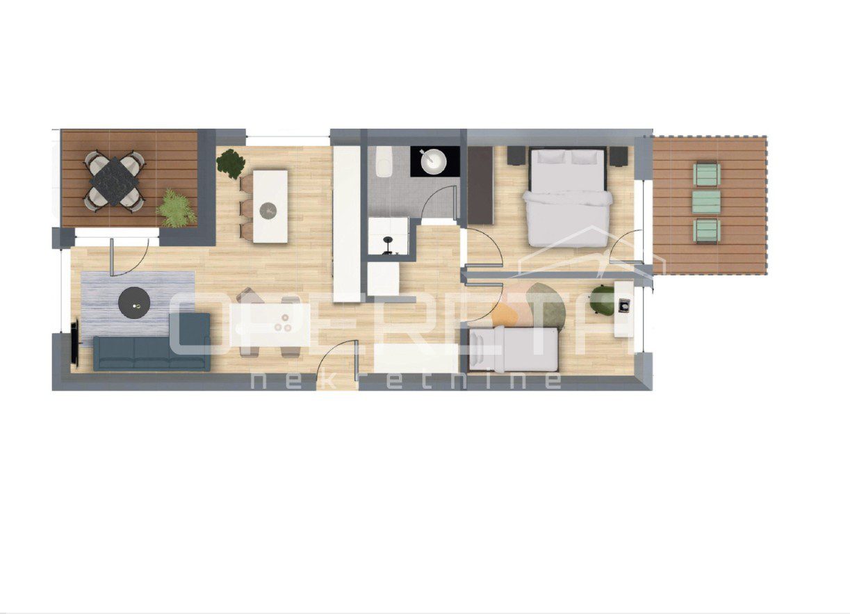 Stan se nalazi na prvom katu stambene zgrade te obuhvaća ulazni hodnik, open space prostor s kuhinjom, blagovaonicom i dnevnim boravkom koji ima izlaz na loggiu. U stanu se nalaze dvije spavaće sobe, od kojih jedna ima vlastiti izlaz na balkon, moderna kupaonica te dva parkirna mjesta koja su uključena u cijenu.