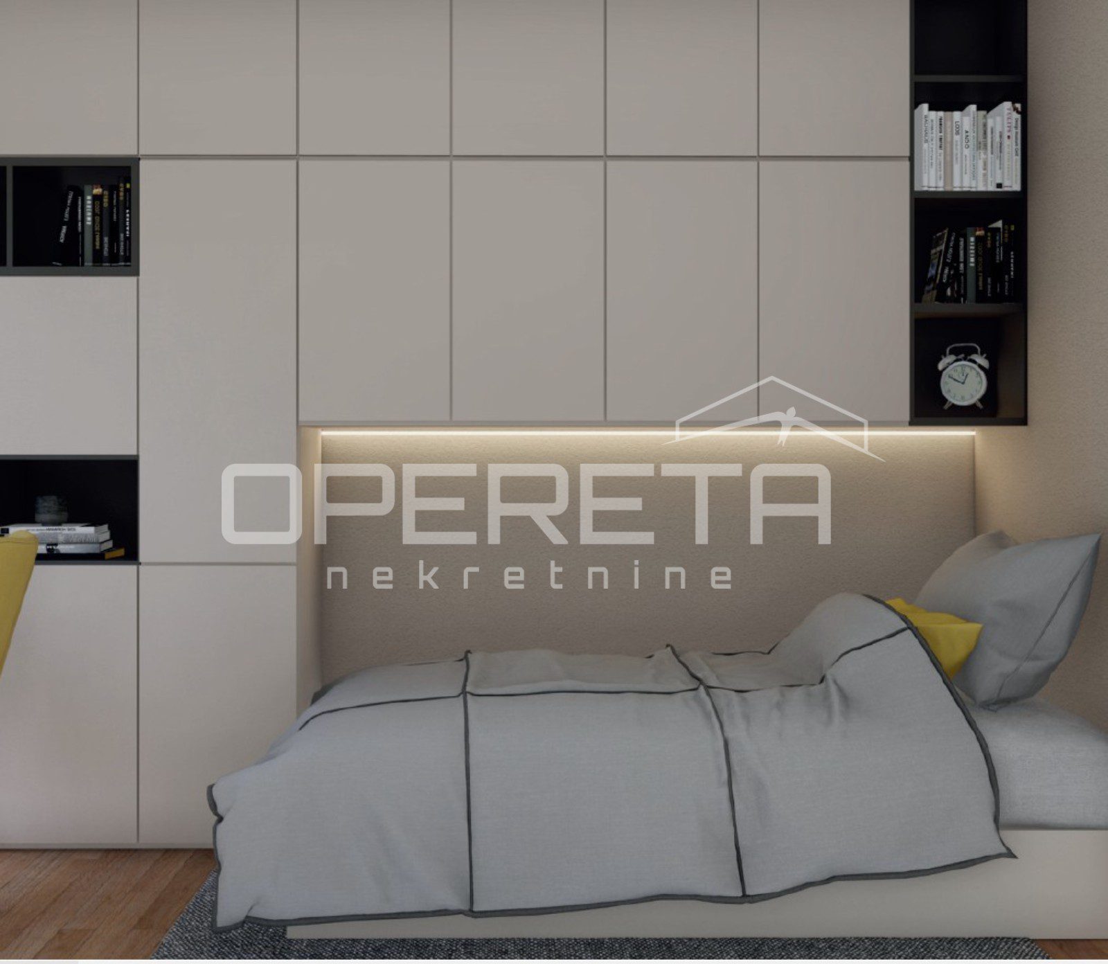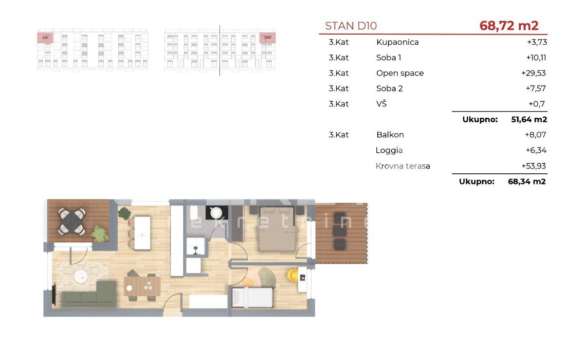 Stan se nalazi na drugom katu stambene zgrade te obuhvaća ulazni hodnik, open space prostor s kuhinjom, blagovaonicom i dnevnim boravkom koji ima izlaz na loggiu. U stanu se nalaze dvije spavaće sobe, od kojih jedna ima vlastiti izlaz na balkon, moderna kupaonica te dva parkirna mjesta koja su uključena u cijenu.