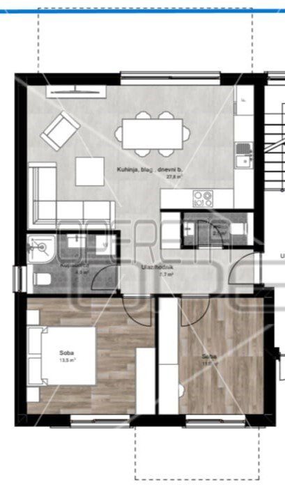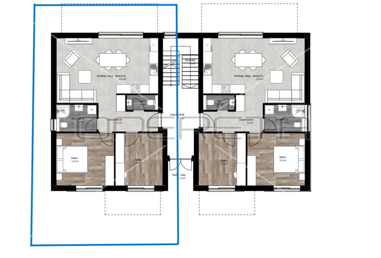 Ovaj simpatičan stan se nalazi u prizemlju te se sastoji od dnevnog boravka, blagovaonice i kuhinje po open space konceptu, dvije spavaće sobe, kupaonice i wc-a.