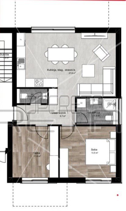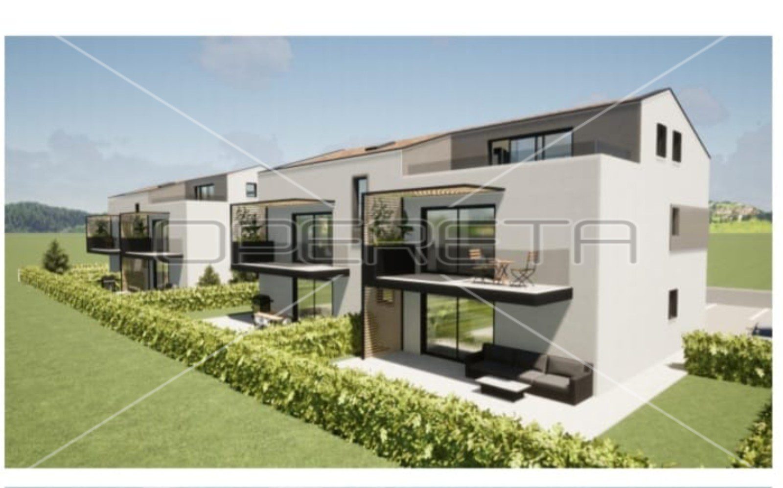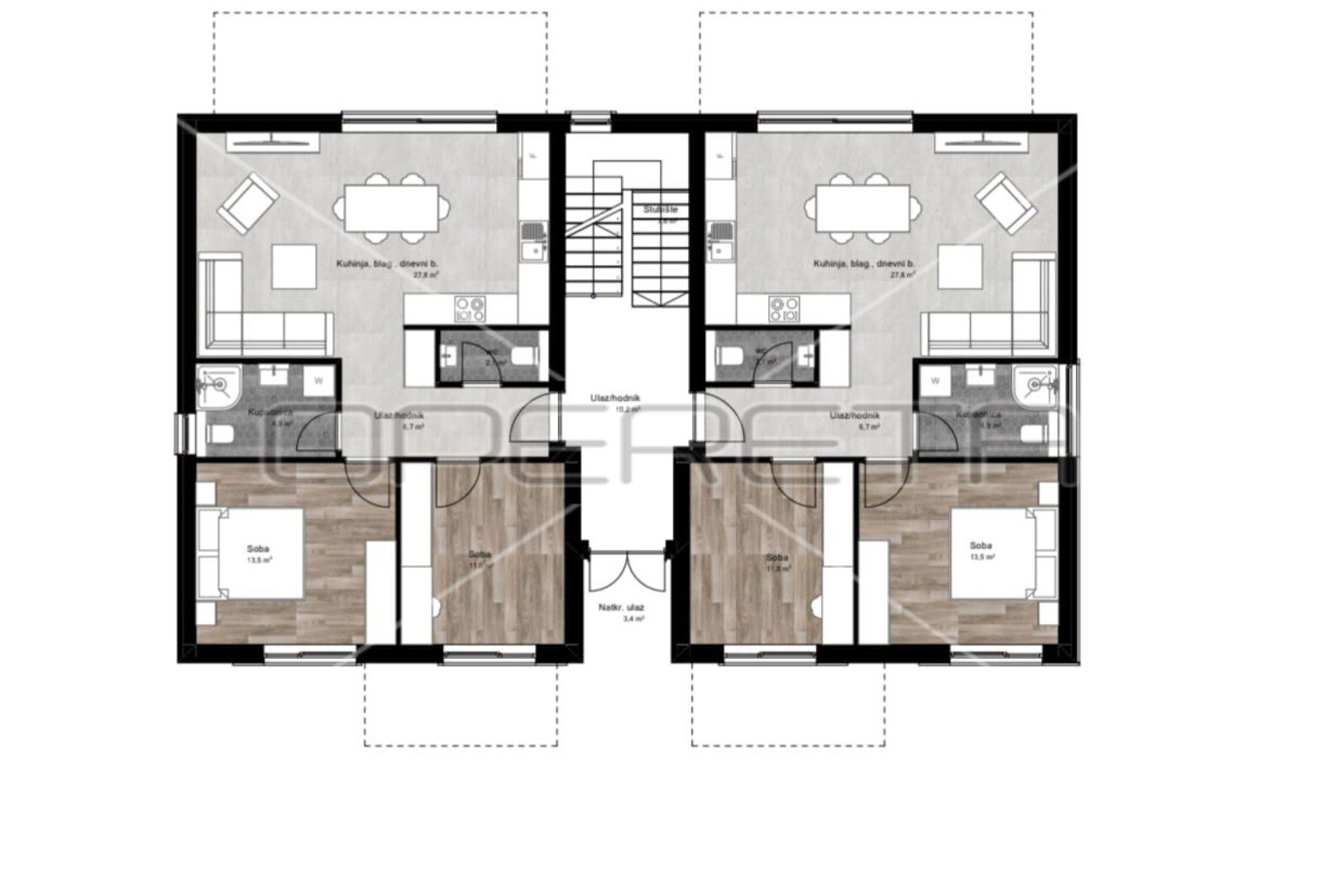 Ovaj simpatičan stan se nalazi u prizemlju te će se sastojati od dnevnog boravka, blagovaonice i kuhinje po open space konceptu, dvije spavaće sobe, kupaonice i wc-a.