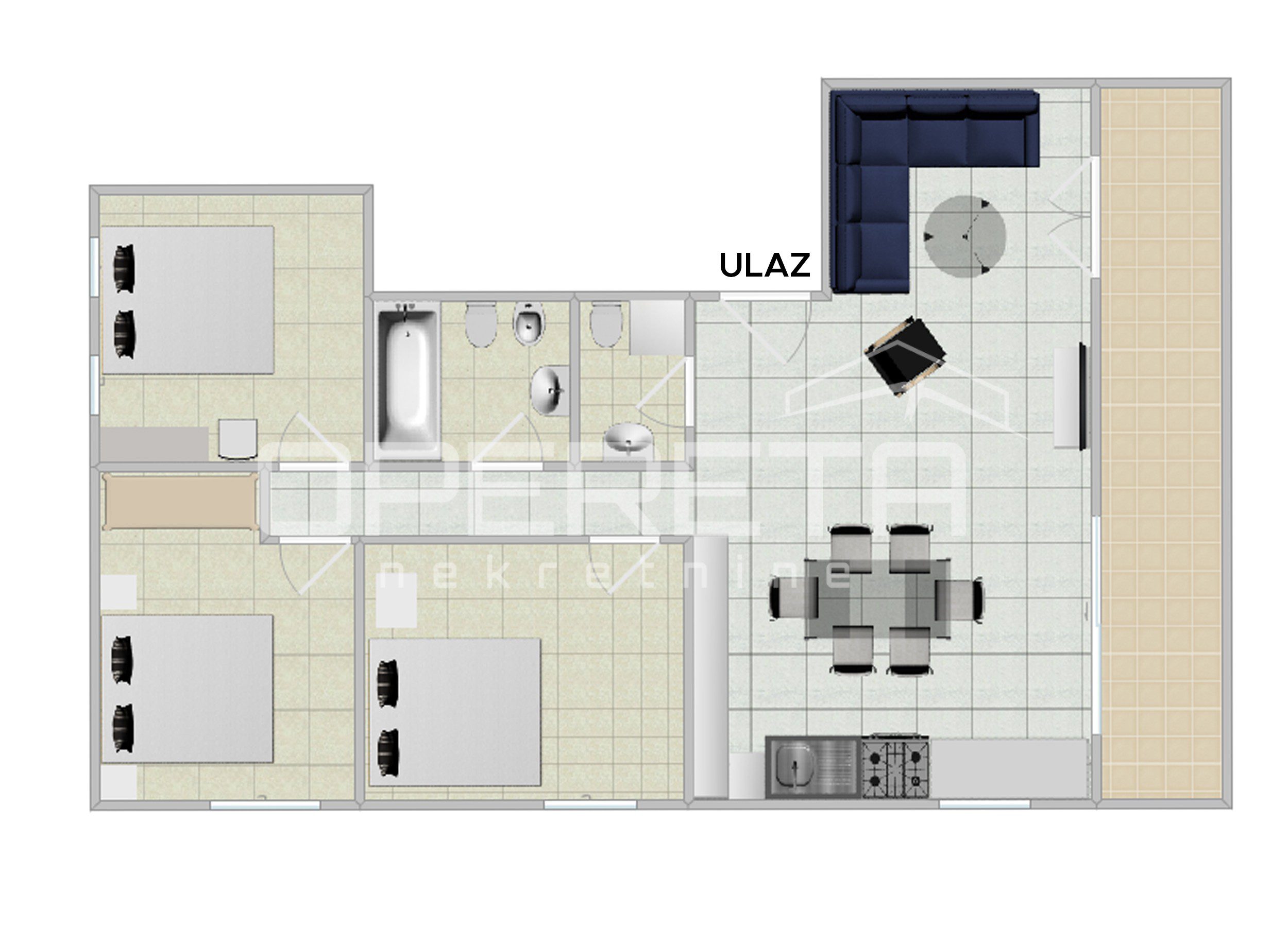 Sastoji se od prostrane dnevne, blagovaone s kuhinjom, tri spavaće sobe, kupaone te velike terase s pogledom na more.