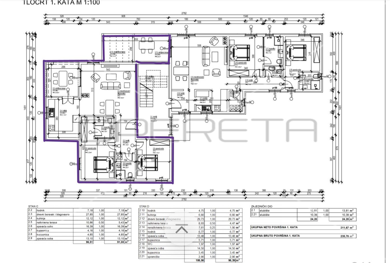 Stan A-C , smješten na prvom katu zgrade, ukupne površine 91,08m2. Sastoji se od hodnika, kupaonice, dvije spavaće sobe od kojih jedna posjeduje vlastitu kupaonicu, kuhinje te dnevnog boravka s blagovaonicom. Iz dnevnog boravka izlaz se na natkrivenu terasu.