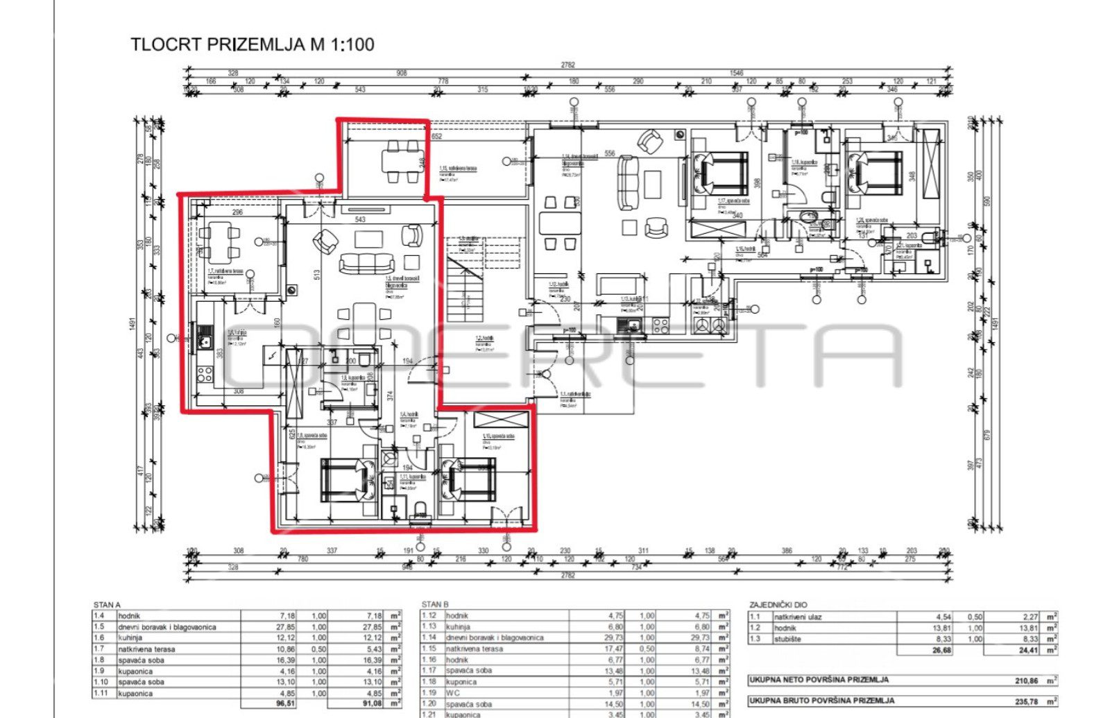 Stan A-A , smješten u prizemlju, ukupne površine 91,08 m2. Sastoji se od hodnika, kupaonice, tri spavaće sobe od kojih jedna posjeduje privatnu kupaonicu, kuhinje te dnevnog boravka s blagovaonicom. Iz dnevnog boravka izlaz se na natkrivenu terasu i prostrani vrt površine cca 120 m2.