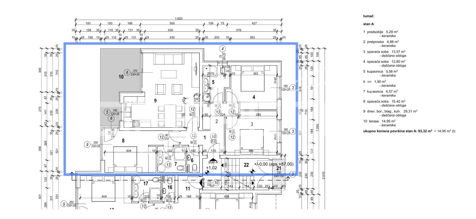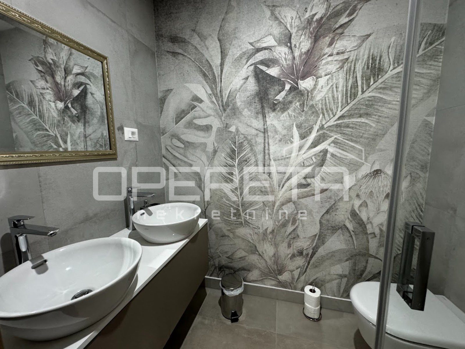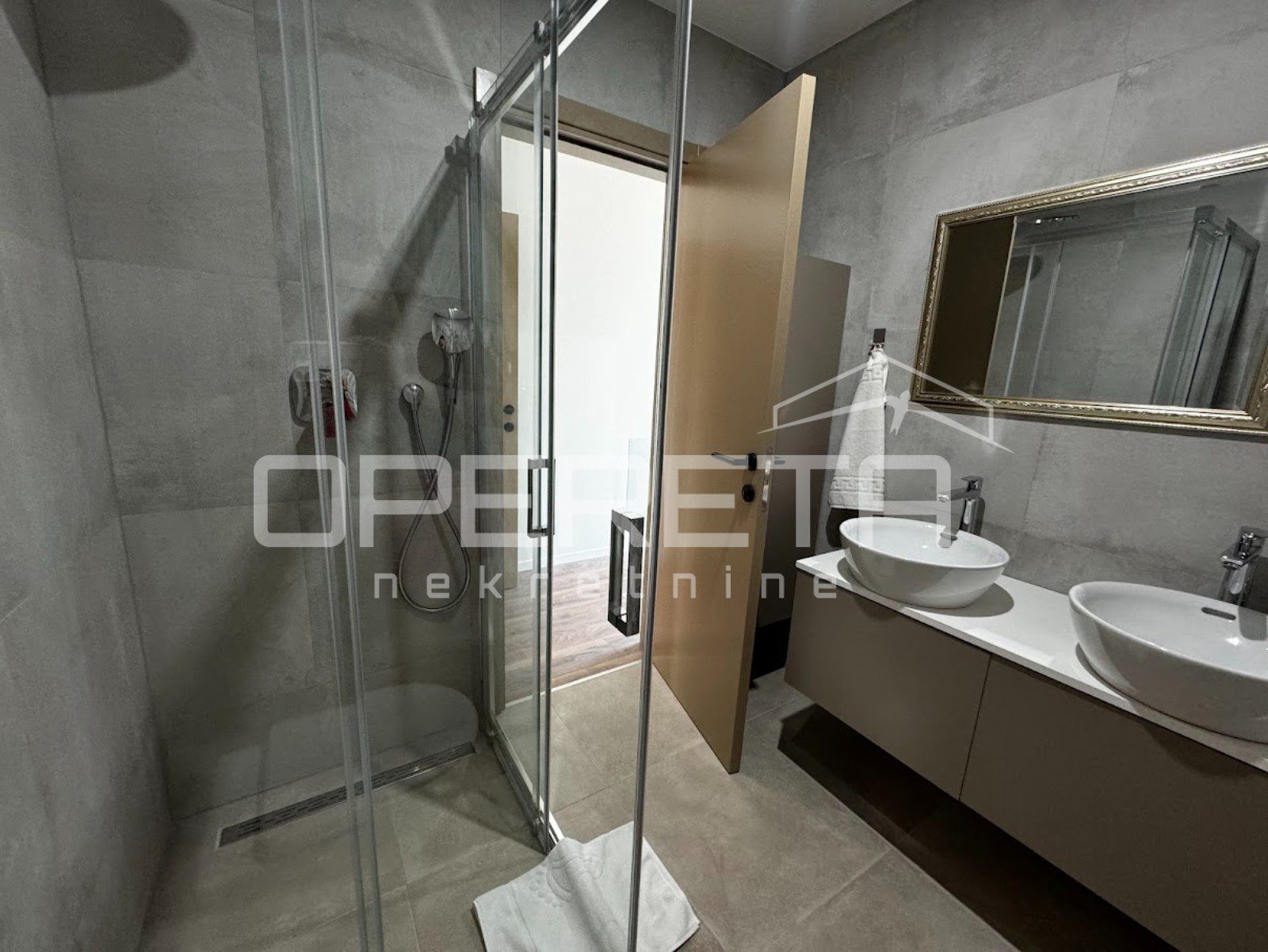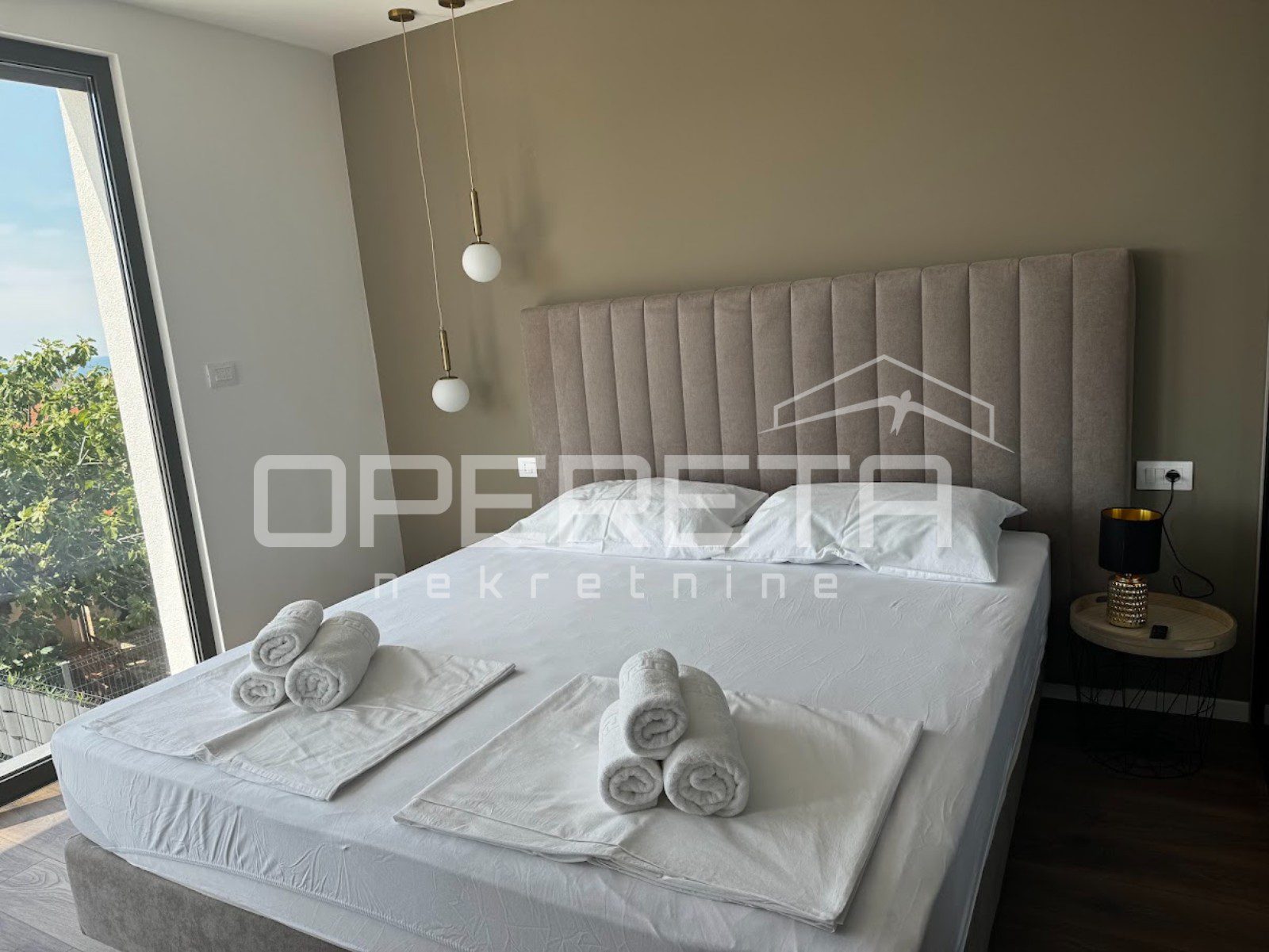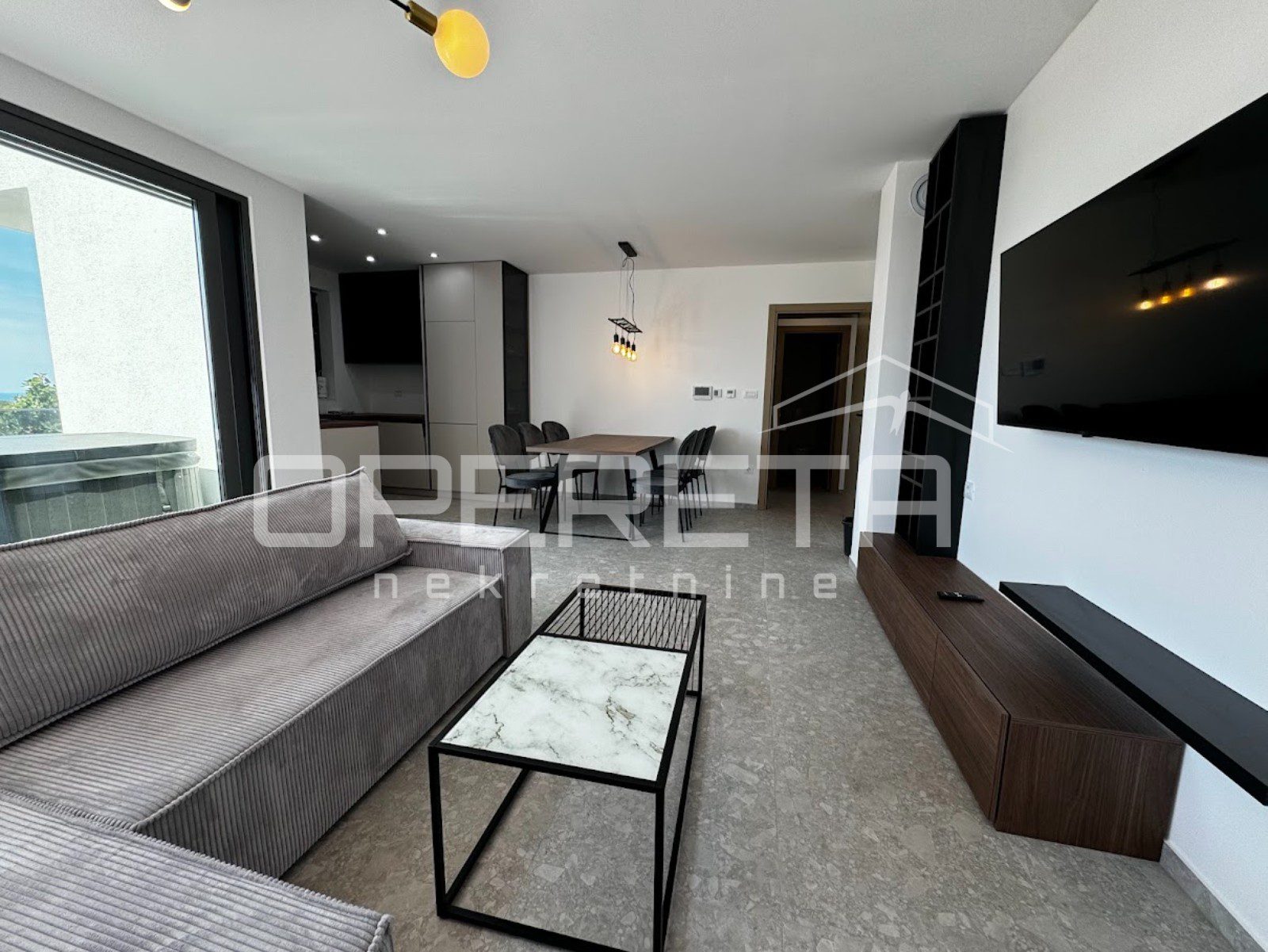 Stan se nalazi na prvom katu intimne stambene zgrade s samo četiri stambene jedinice, površine 96,56 m², nudeći moderan komfor i eleganciju. Promišljeni raspored uključuje privlačno ulazno predvorje, prostrani dnevni boravak otvorenog plana povezan s kuhinjom i blagovaonicom, tri ugodne spavaće sobe te dvije kupaonice (jedna povezana s glavnom spavaćom sobom). Odvojeni toalet dodaje praktičnost, dok prostrana terasa s jacuzzijem pruža savršeno mjesto za opuštanje i druženje uz prekrasan pogled na more i okolnu prirodu. Stanu također pripada zasebna spremište u podrumu zgrade te dva privatna parkirna mjesta.