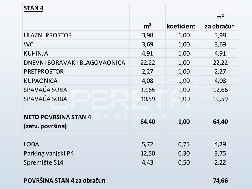 Stan S4 nalazi se na prvom katu zgrade. Sastoji se od 2 spavaće sobe, kuhinje, dnevnog boravka i blagovaonice, kupaonice, toaleta te hodnika. Pripada mu i loggia površine 5,72 m2, spremište te vanjsko parkirno mjesto.