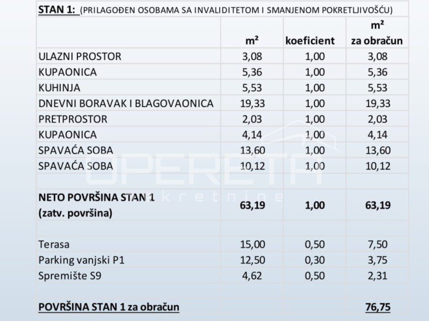 Stan S1 nalazi se u prizemlju zgrade. Sastoji se od 2 spavaće sobe, kuhinje, dnevnog boravka i blagovaonice, 2 kupaonice te hodnika. Pripada mu i terasa površine 15m2, spremište te vanjsko parkirno mjesto. Prilagođen je u potpunosti osobama s invaliditetom.