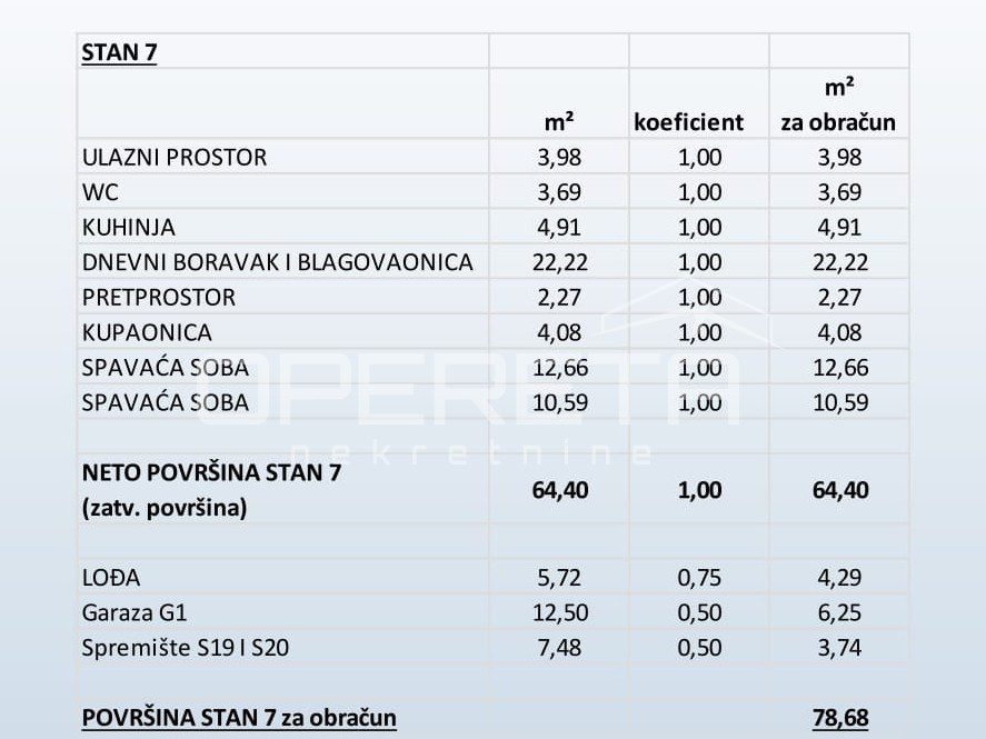 Stan S7 nalazi se na drugom katu zgrade. Sastoji se od 2 spavaće sobe, kuhinje, dnevnog boravka i blagovaonice, kupaonice, toaleta te hodnika. Pripada mu i loggia površine 5,72m2, 2 spremišta te garažno parkirno mjesto.