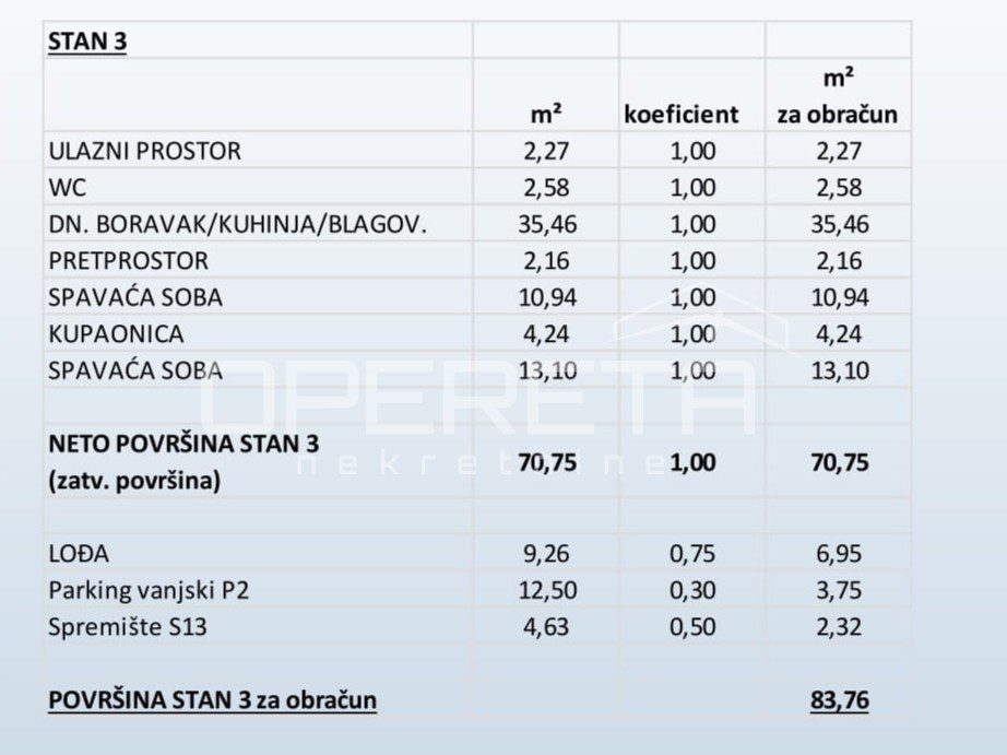 Stan S3 nalazi se u prizemlju zgrade. Sastoji se od 2 spavaće sobe, kuhinje, dnevnog boravka i blagovaonice, kupaonice, toaleta te hodnika. Pripada mu i loggia površine 9,26 m2, spremište te vanjsko parkirno mjesto.
