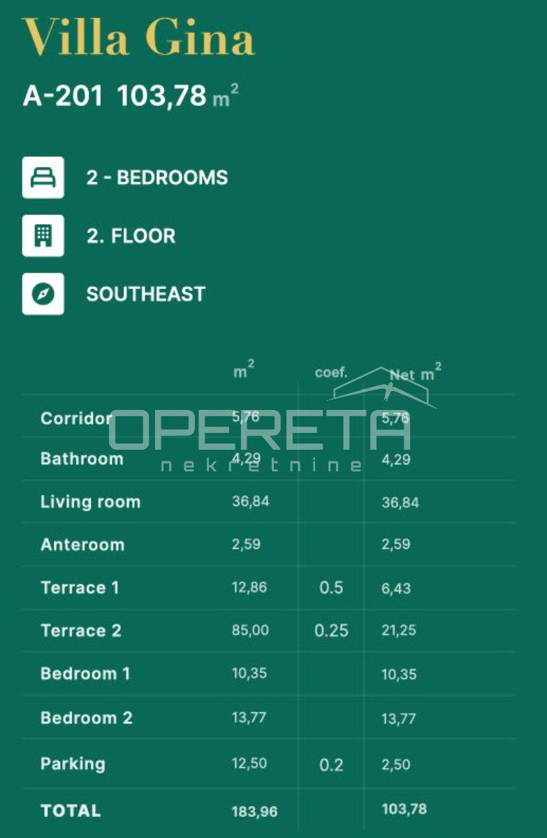 Stan G201 nalazi se na 2. katu, a sastoji se od: hodnika, predsoblja, kupaonice, dnevnog boravka sa kuhinjom i blagavaonicom u open space konceptu, terase 1, terase 2, 2 prostrane spavaće sobe i parkinga.