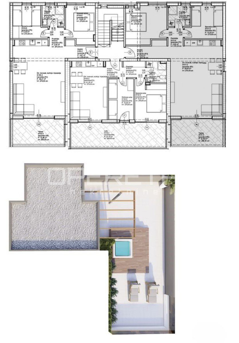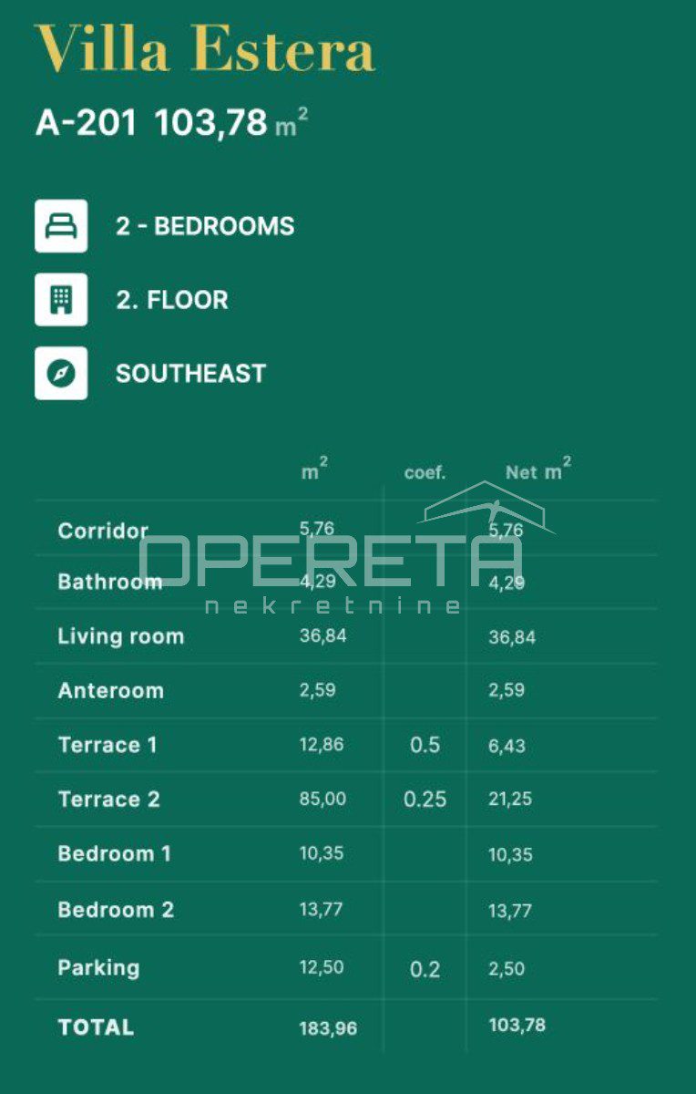 Stan E201 nalazi se na 2. katu, a sastoji se od: hodnika, predsoblja, kupaonice, dnevnog boravka sa kuhinjom i blagavaonicom u open space konceptu, terase 1, terase 2, 2 prostrane spavaće sobe i parkinga.